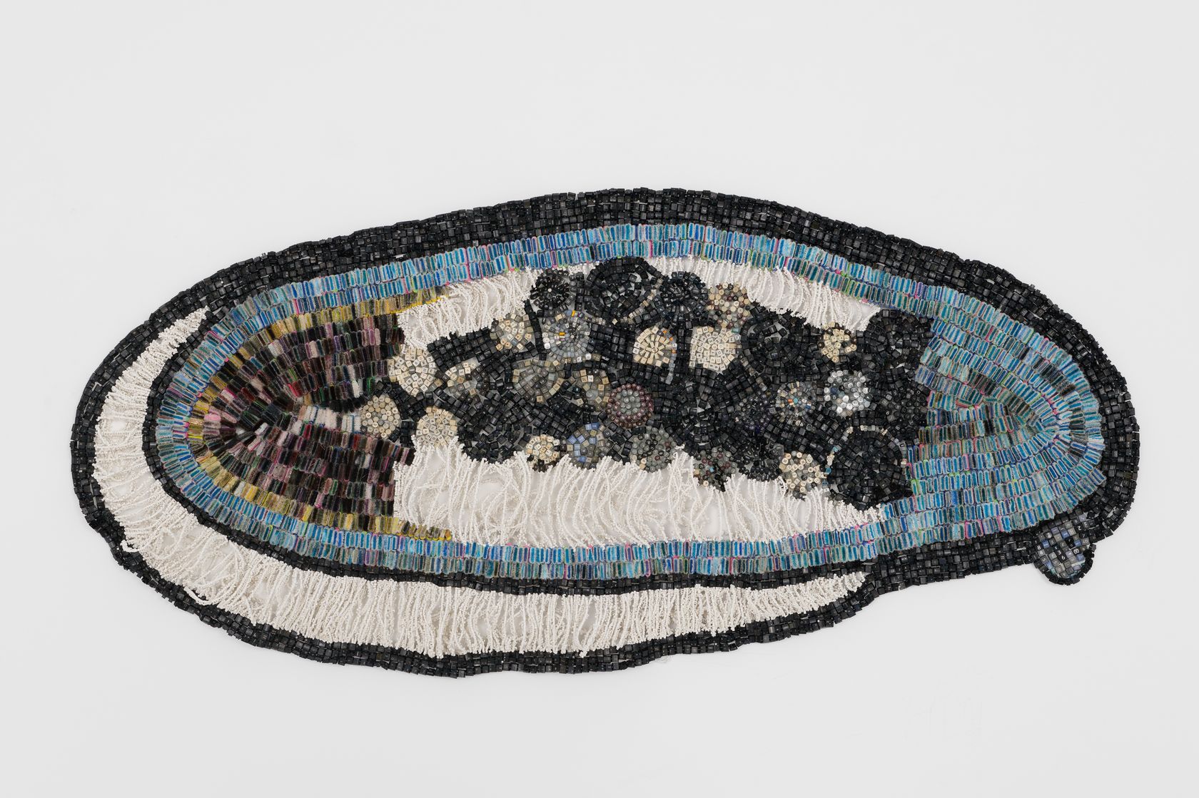 Moffat Takadiwa creates large format sculptures from materials found on garbage dumps, notably computer parts, plastic bottle-caps, toothbrushes and toothpaste tubes. After gathering great quantities of these objects and sorting them by color and shape, the artist weaves these discarded scraps into rich wall hangings. Once suspended, these post-industrial fabrics, through their intricate beauty, acquire an aura of ritual or totemic artifacts.