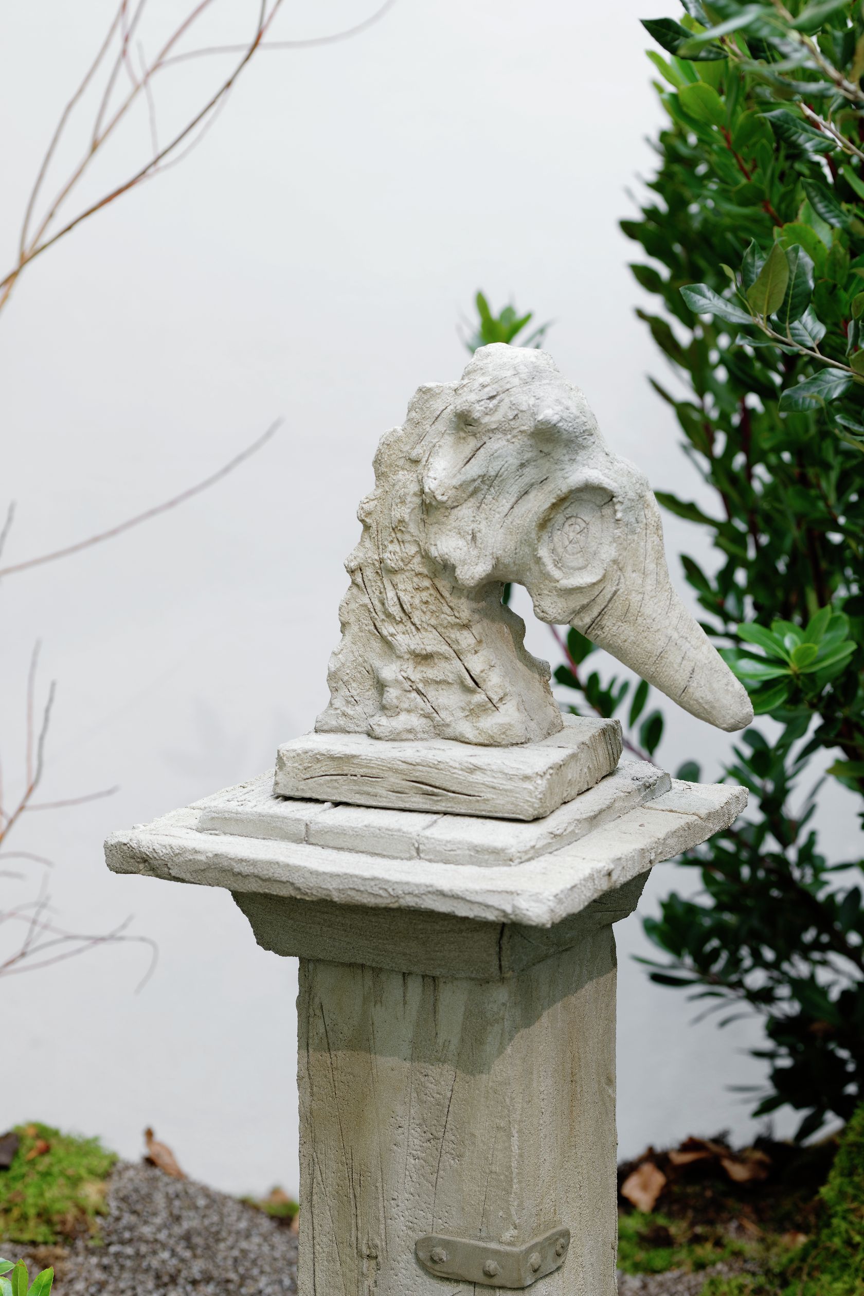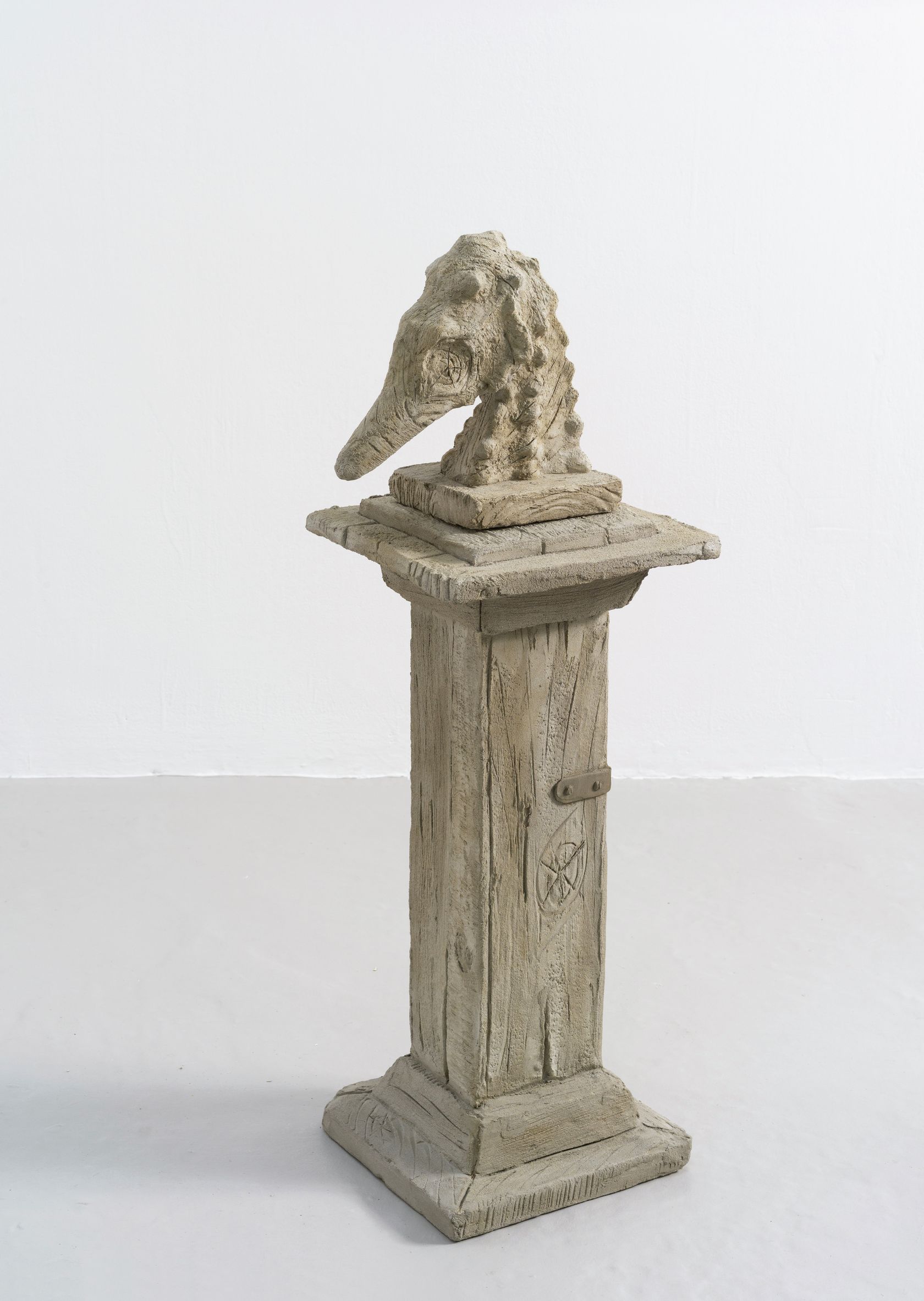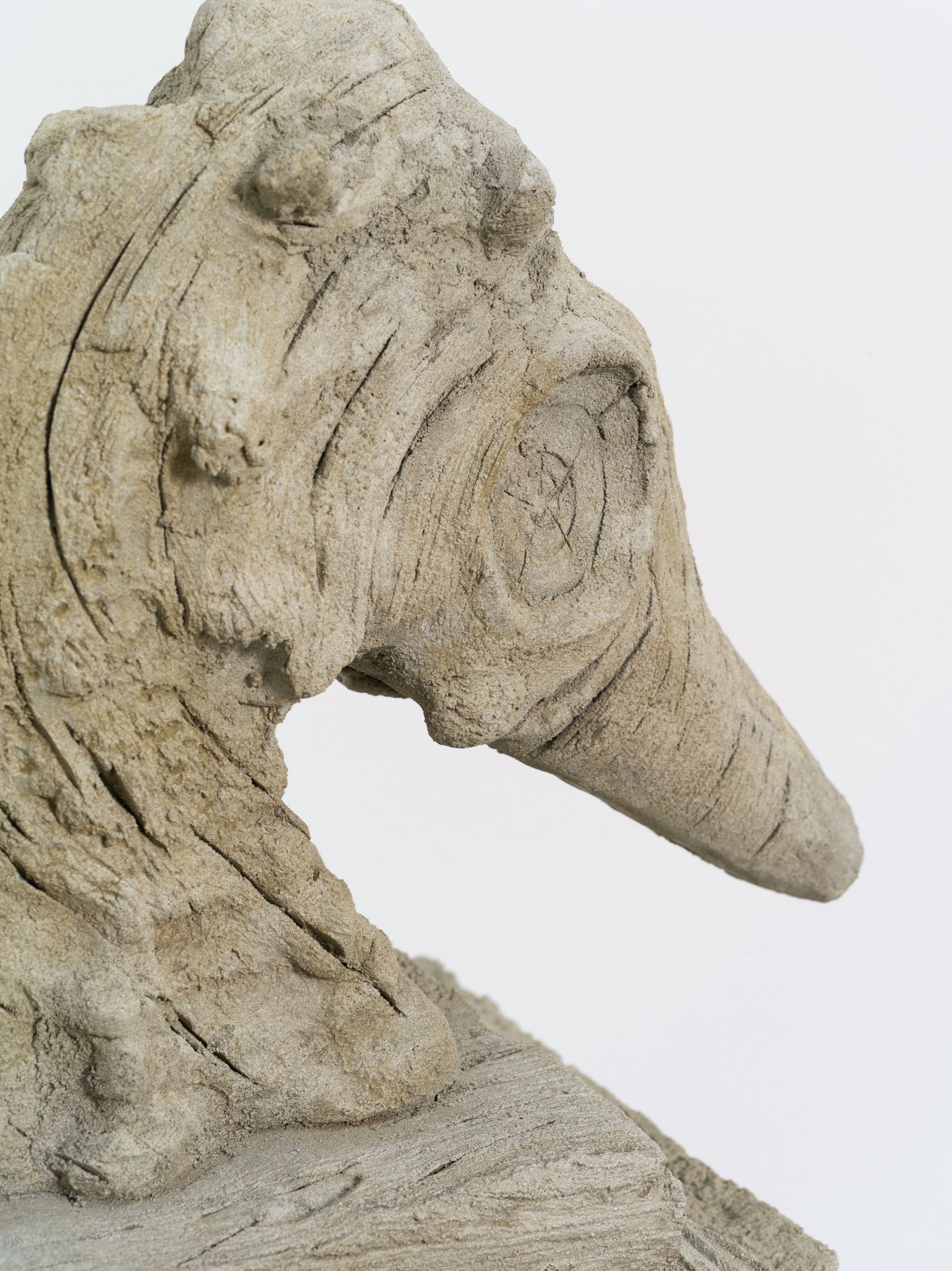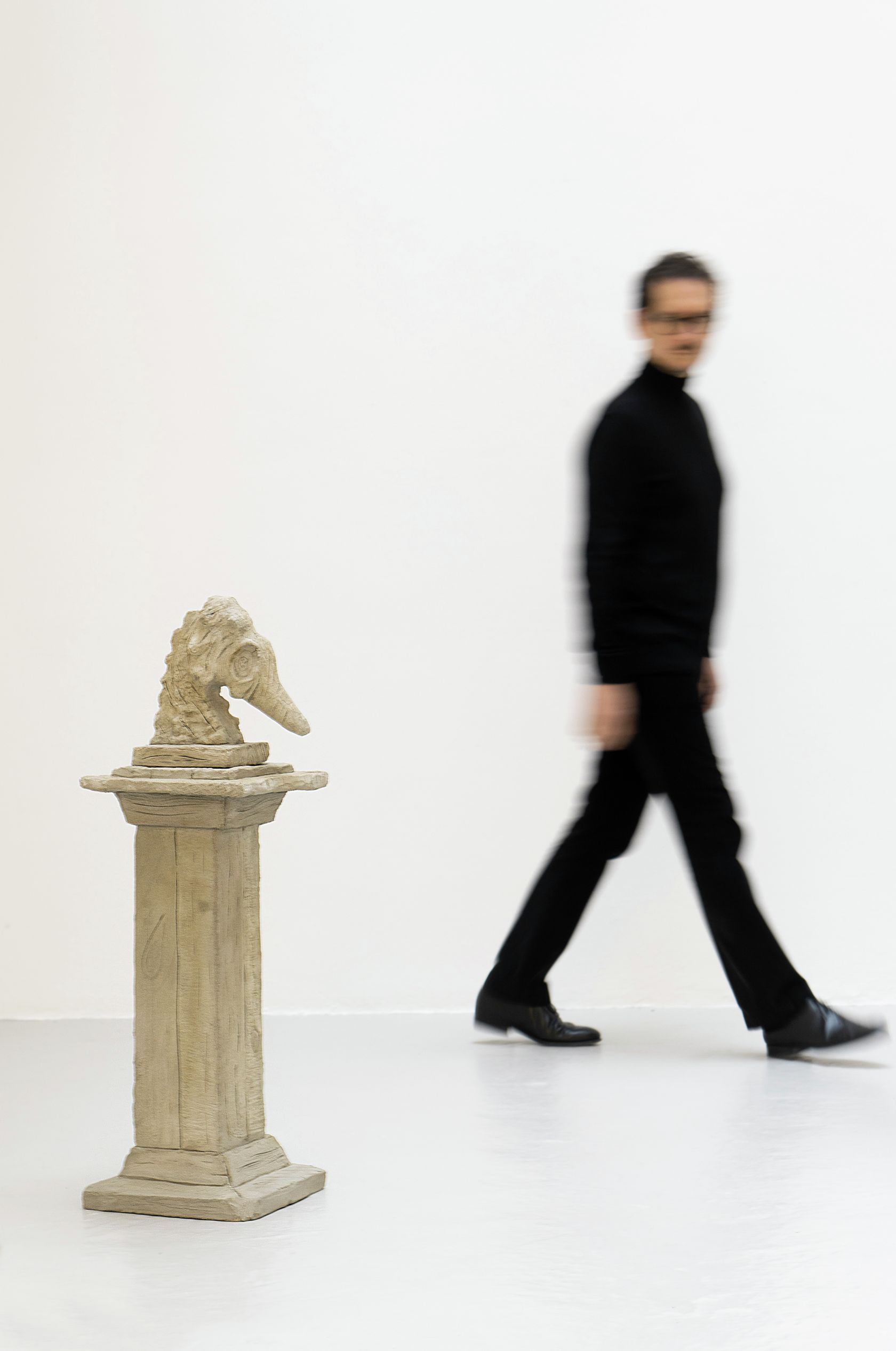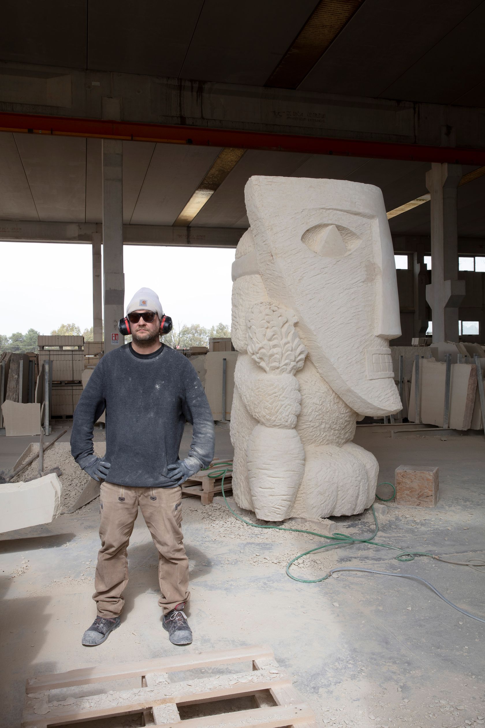 Stefan Rinck’s stone figures form a motley and comical community of, for the most part, animals, chimeras and monsters. They wear costumes and masks; are endowed with particular symbols or characteristics, some bear the names of heroes of Greek mythology or of legend. Rinck’s sculpted figures make up a discordant but related assembly of non-humans: they come from elsewhere, an archaic imaginary world, woven from myths and legends. With his collection of fauna, the artist is using a technique typical of the Middle Ages: sculpting his figures directly from stone.