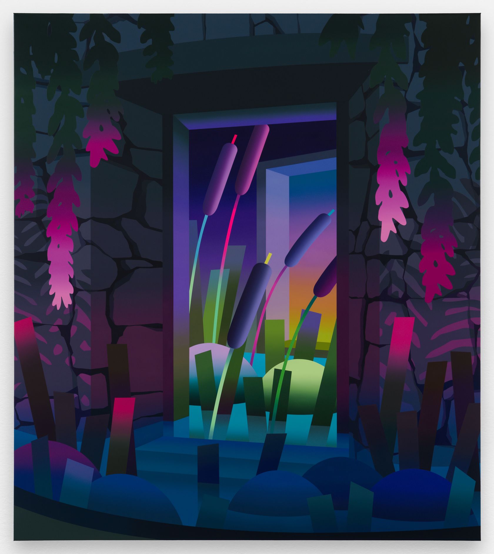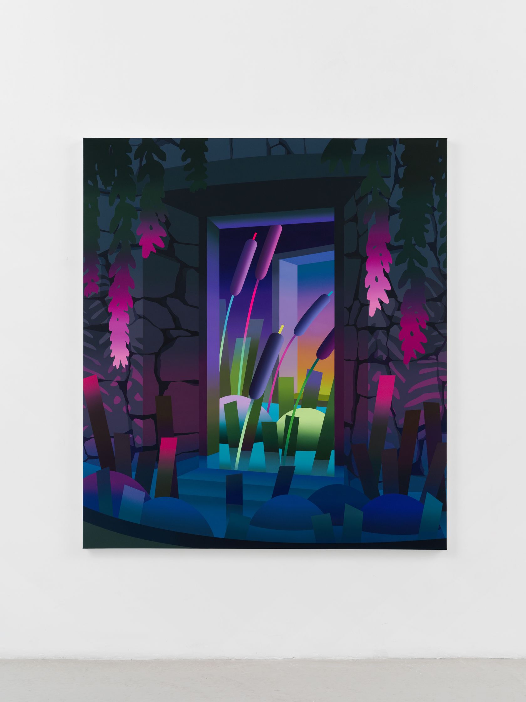 By means of her impeccably smooth execution, Amélie Bertrand (born in 1985) is able to distance herself from ideal landscapes inspired by nature, and shape decors that fall somewhere between dreams and nightmares. The planes and surfaces of her works are assembled in a complex and meticulous manner, branching out into skewed perspectives and shallow horizons. All kinds of materials and motifs typical of our era saturate her compositions: OSB, laminates, wire mesh, tiles, fleecing, chains, foliage, camouflage etc. Colors are applied in gradients, yet always as a single layer, as if trapped on the surface of an impenetrable screen. Amélie Bertrand creates an atmosphere of déjà-vu, a contemporary ambience that is both psychological and physical within the confined space of the painting. As the missing link between Giotto and West Coast art, Amélie Bertrand combines the great traditions with synthetic psychedelia, transforming contemporary visual culture into carefully controlled constructs of flat tints.