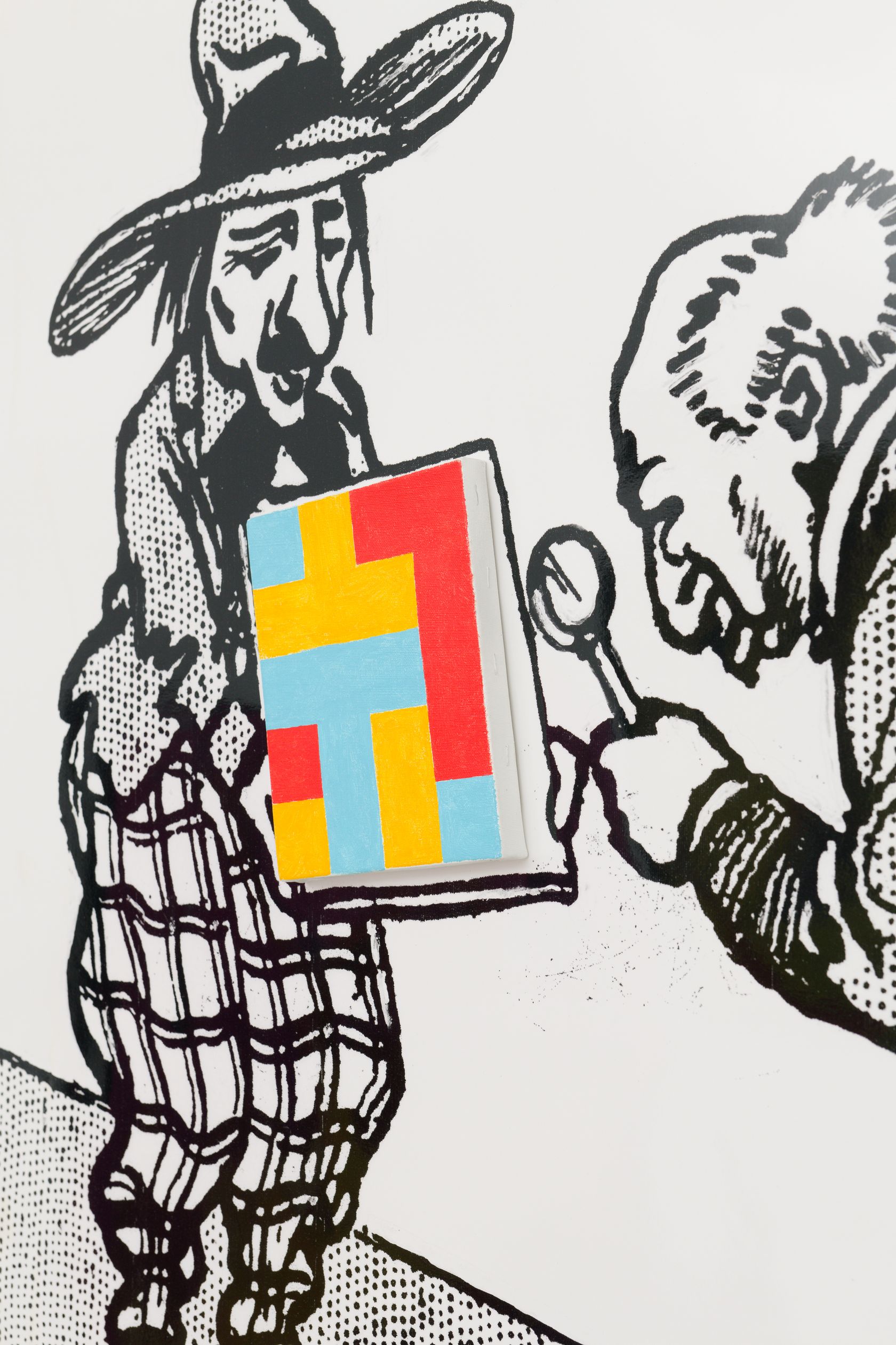 Ernest T. began his artistic experimentation in the 1960s with a collection of small, comic calendars, which eventually ended up as a series under the name Dessins français (French Drawings). During the 1980s, he created his pseudonym and began to work on his well-known series Peintures nulles (Useless Paintings), which he envisaged as ‘Painting Degree Zero’. In reaction to the phenomenon of the idolization of the artist, which valued the signature more than the work itself, Ernest T. produced a number of paintings where his signature took over the whole canvas. These works followed a protocol in which capital ‘T’s, painted in three primary colors, dovetail with each other in the manner of Penrose tiling, where letters of the same color never touch each other. These narcissistic arrangements are integrated into offbeat sketches that mock the legitimization processes of art as well as other practices linked with the signature of a work, its authenticity, its hidden meanings, etc.