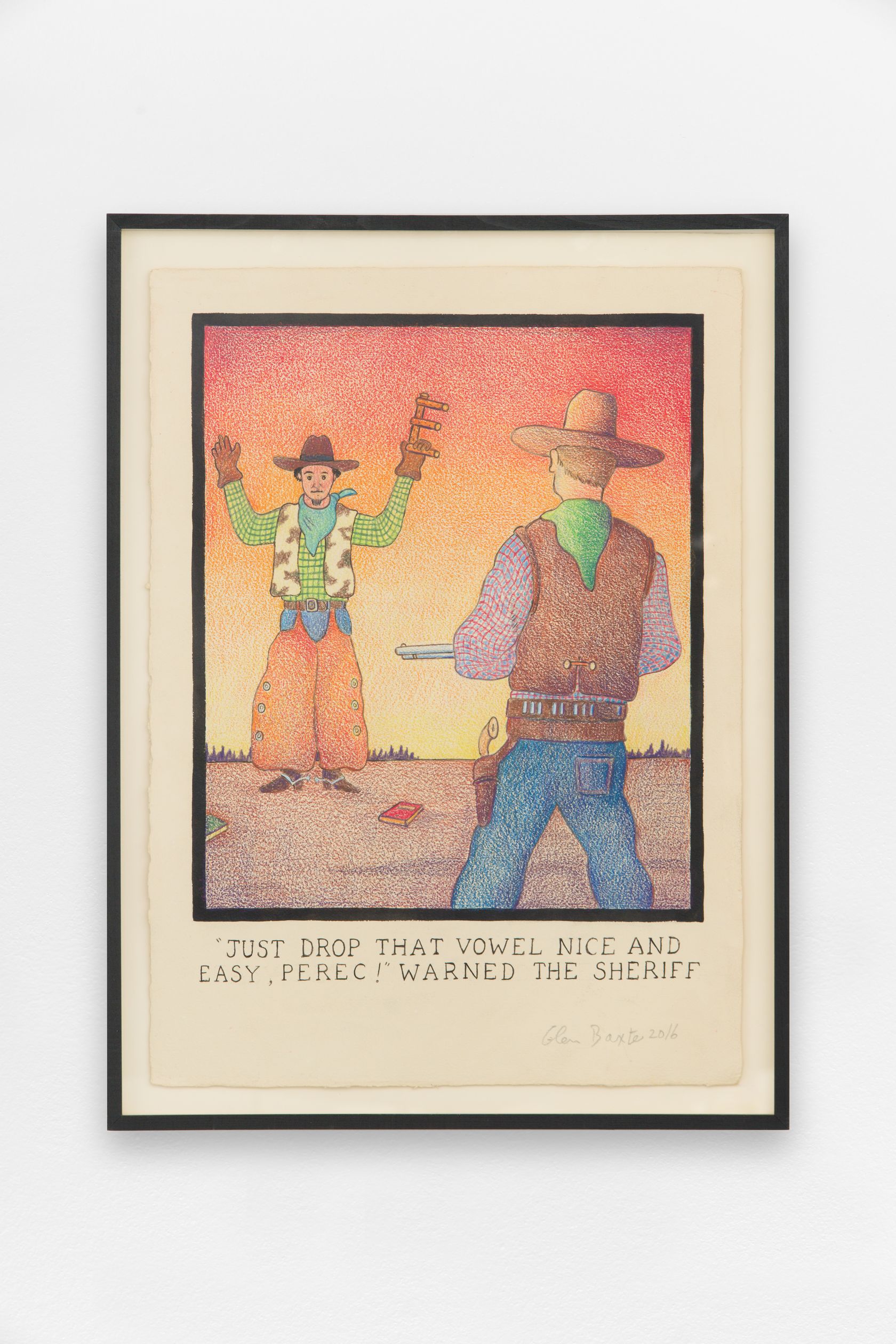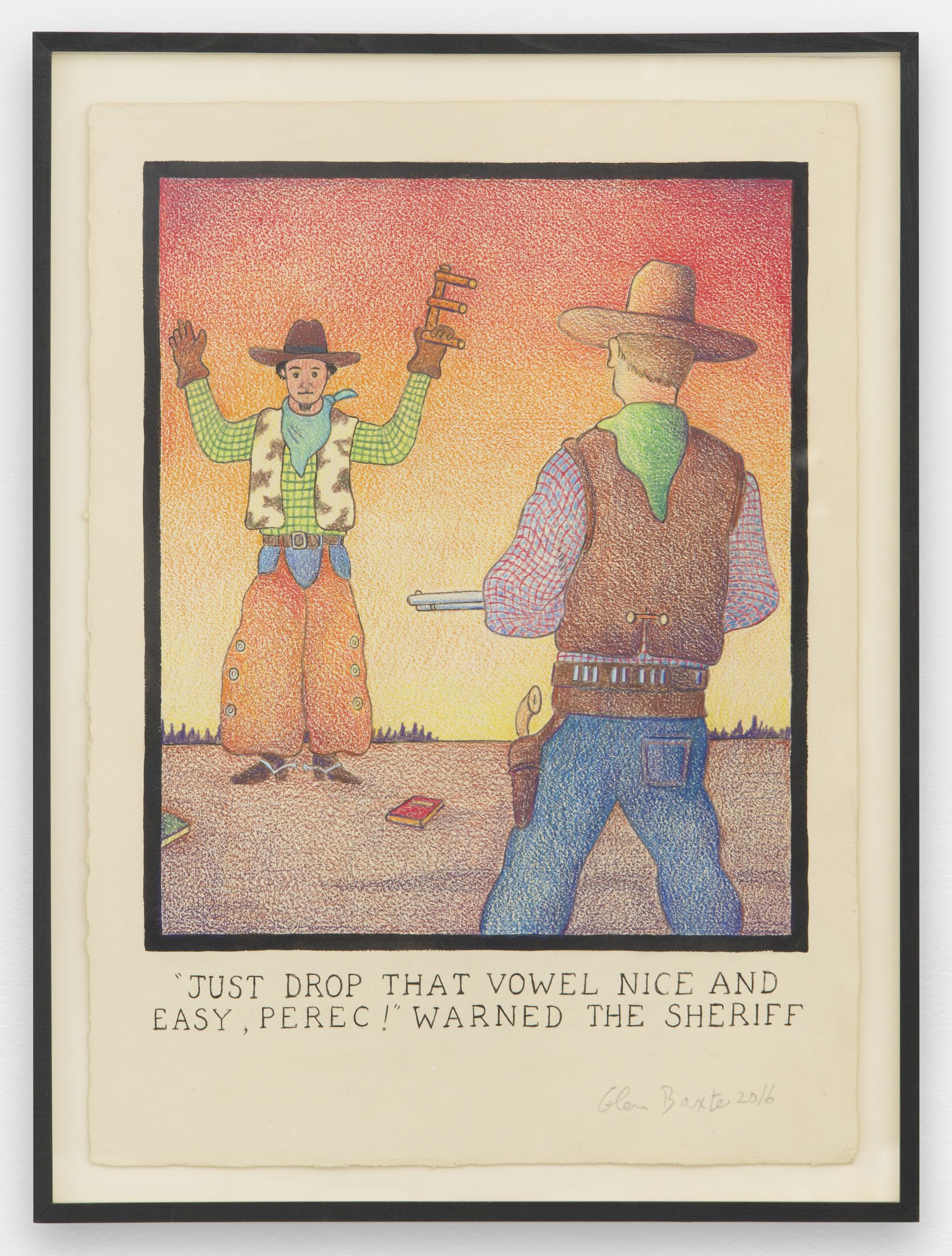 Glen Baxter’s œuvre is immediately recognisable. He has remained true to his simple and highly effective process for almost fifty years: a comic sketch is accompanied by a short, incongruous, even discordant caption. Baxter elaborates a parallel world based on a burlesque hijacking of an iconography sourced from the 1930s and 40s, which provides him with an assortment of cowboys, boy scouts and golfers in tweed. His refined prose contrasts with his seemingly outdated imagery, blending elegantly in a quest for the frisson cherished by surrealists such as de Chirico and Max Ernst. Bewilderingly nonsensical, astonishingly witty and tragi-comic, like life itself, these talkative drawings celebrate the heady rush of linguistic mishaps.