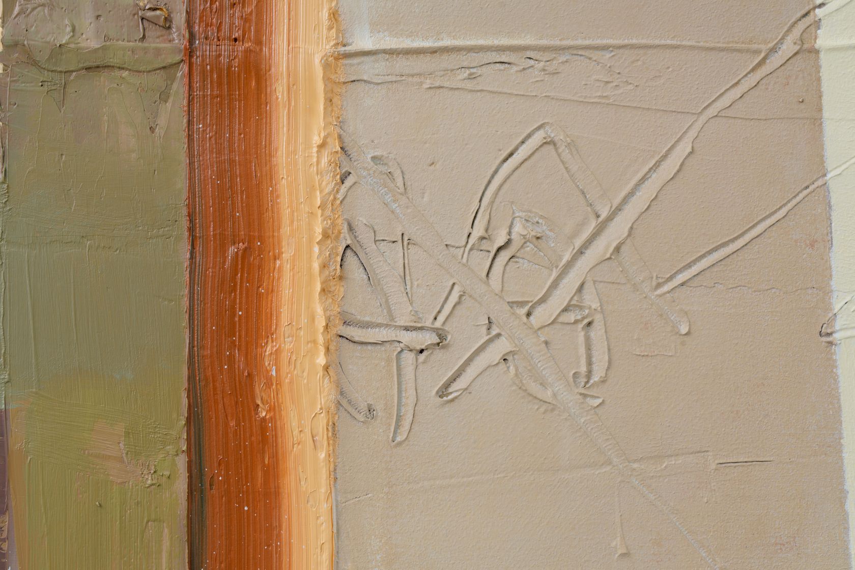 Les palettes d'Hugo Capron résultent de fines investigations chez des fournisseurs du monde entier à la recherche des nuances les plus justes. Sur la toile, elles se révèlent dans une gamme de matières, de jus et de surépaisseurs lumineuses qui font valoir la vitesse de l'exécution. Le geste est quasiment calligraphique, c'est une mêlée de virgules et de boucles.
