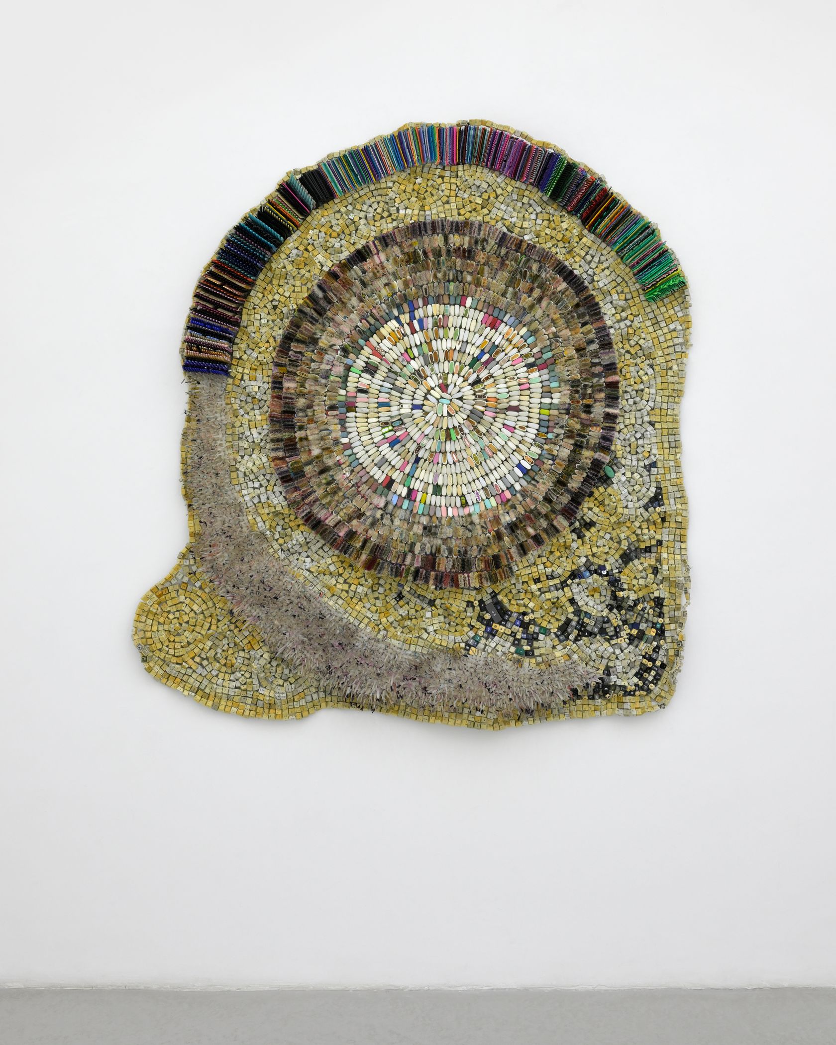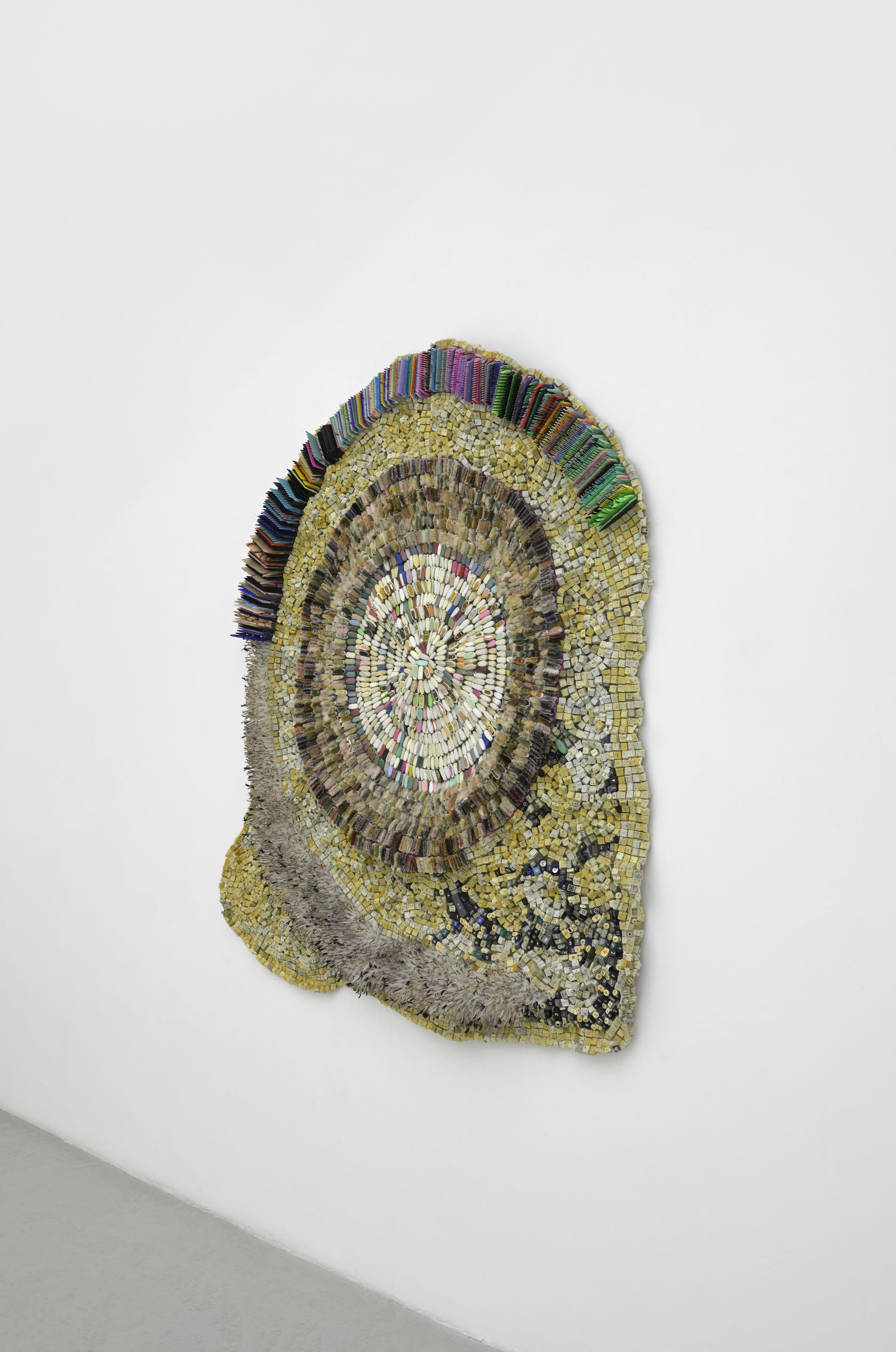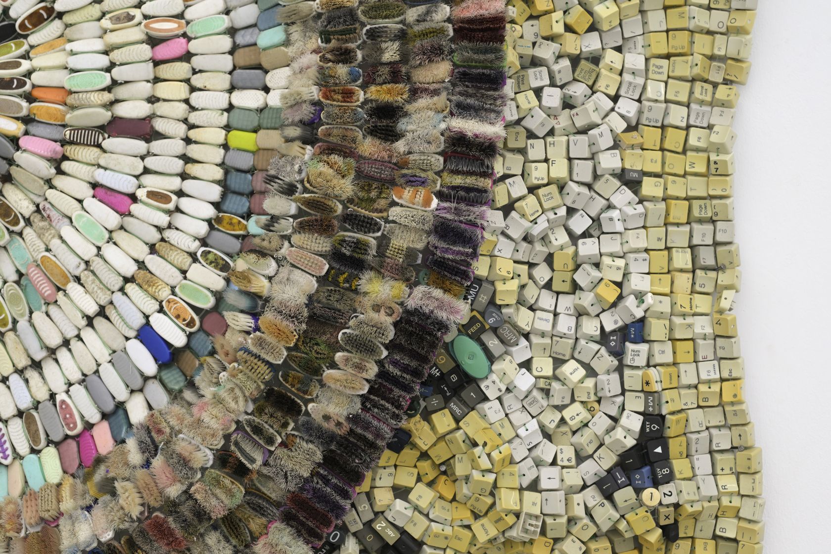 Moffat Takadiwa creates large format sculptures from materials found on garbage dumps, notably computer parts, plastic bottle-caps, toothbrushes and toothpaste tubes. After gathering great quantities of these objects and sorting them by color and shape, the artist weaves these discarded scraps into rich wall hangings. Once suspended, these post-industrial fabrics, through their intricate beauty, acquire an aura of ritual or totemic artifacts.