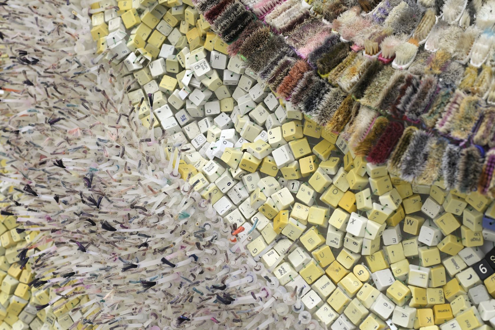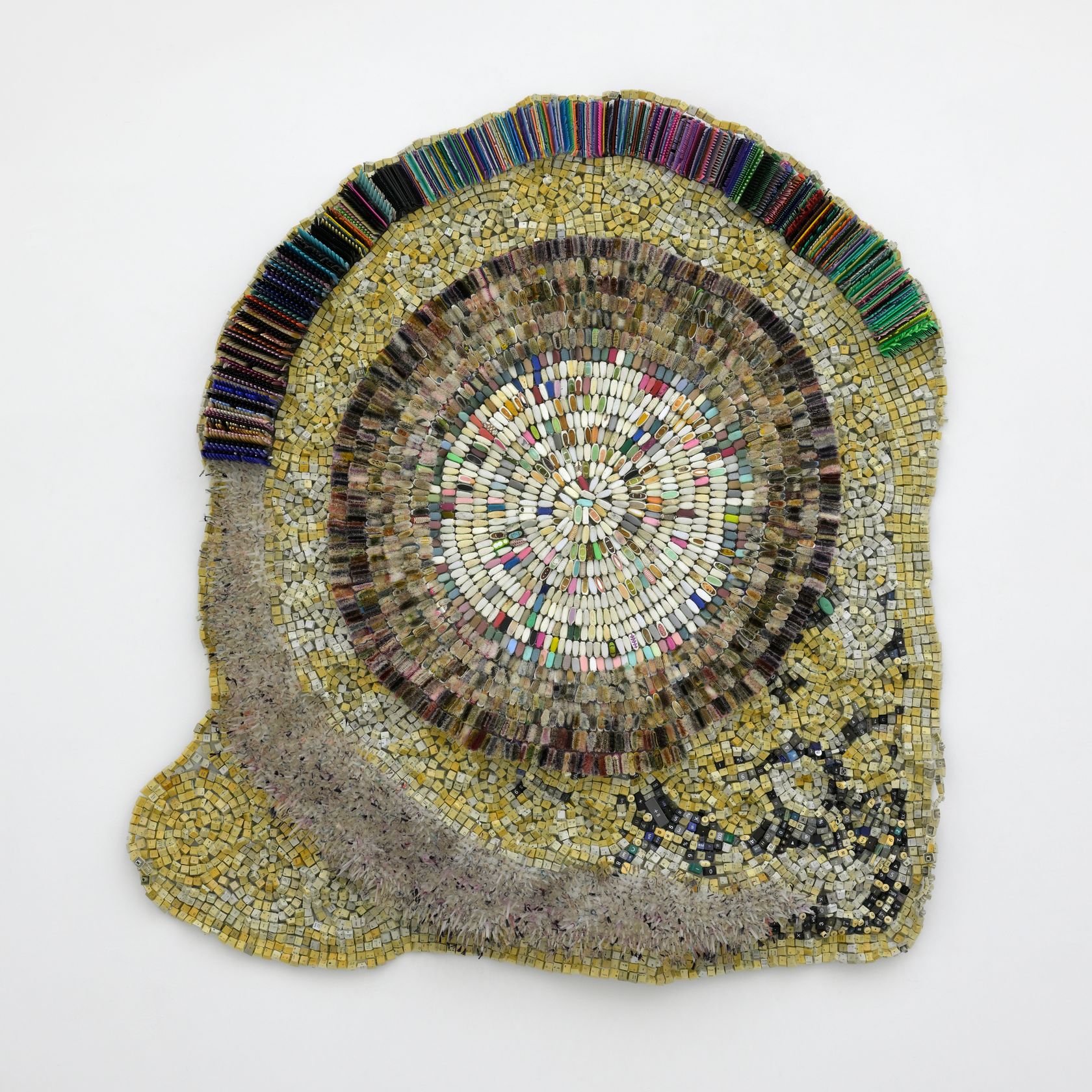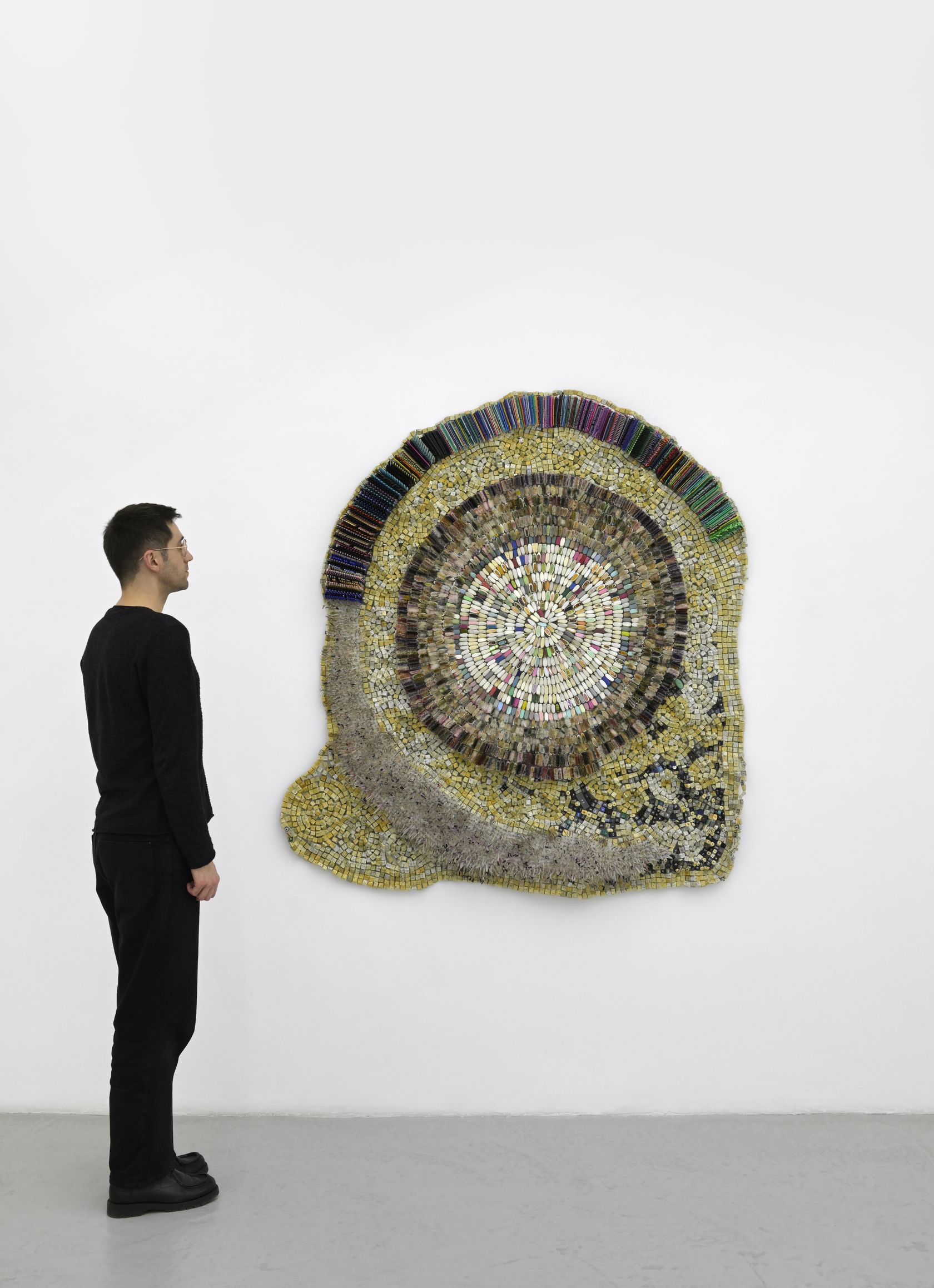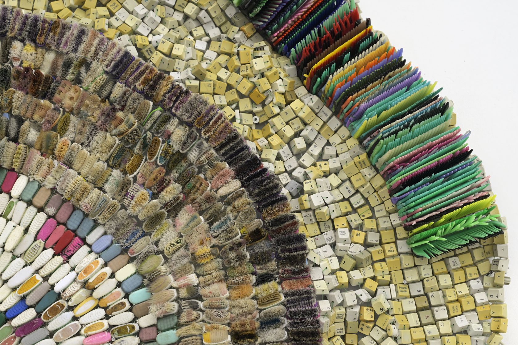 Moffat Takadiwa creates large format sculptures from materials found on garbage dumps, notably computer parts, plastic bottle-caps, toothbrushes and toothpaste tubes. After gathering great quantities of these objects and sorting them by color and shape, the artist weaves these discarded scraps into rich wall hangings. Once suspended, these post-industrial fabrics, through their intricate beauty, acquire an aura of ritual or totemic artifacts.