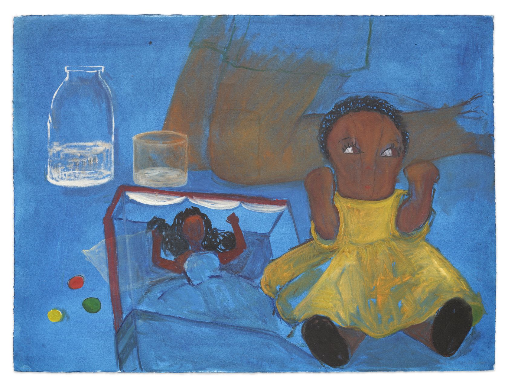 The African-American artist Philemona Williamson (b. 1951) brings together personal and more universal narratives in her brightly colored, large format paintings that portray children and teenagers, often in mysterious situations. She paints directly onto her canvases without preliminary sketches and her paintings thus resemble palimpsests telling their own stories, with multiple layers, figures and scenes appearing across the support, before seemingly being abandoned. Williamson’s works are deeply rooted in her childhood memories and include references to memorabilia, such as dolls typical of American popular culture from the artist’s personal collection, and as such are an invitation to explore mysterious and unfinished tales.