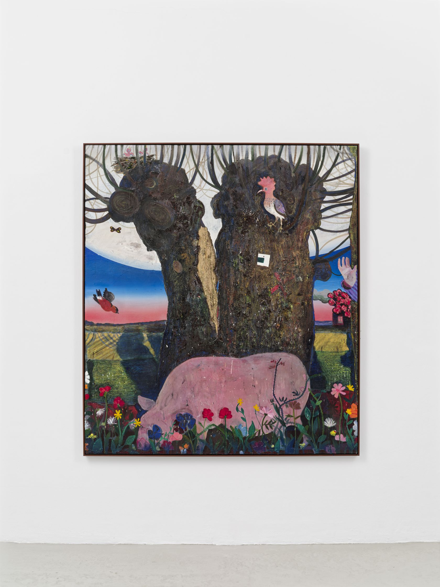 Pieter Jennes’ art is narrative in nature and his means of expression—richly colored surfaces and dense motifs in particular—are akin to illustration. The style of his work, refined by historical references to the flat perspectives of Islamic miniatures for example, or the satirical aspects of Weimar-era artists such as Georg Grosz as well as the face-to-face aspect of theatre, lend his painting a profoundly idealistic slant. The world he depicts, is set at the crossroads of the everyday and the dreamlike, a fundamentally familiar setting where dreams branch off from the ordinary. His creatures, both human and animal, still or in movement, set in landscapes that are reduced to a patchwork of patterns and textures are imbued with a variety of human emotions that range from the simplest to the most complex. Love melancholy, desire, fear… The primacy of somatic feeling is essential in Pieter Jennes’ work both in the highly tactile visual dimension of the artworks and in the moments of contact between the living beings he represents.