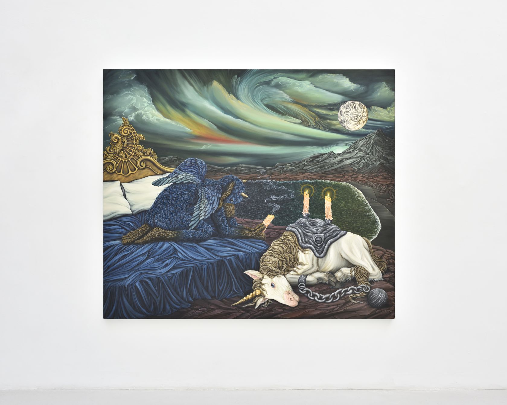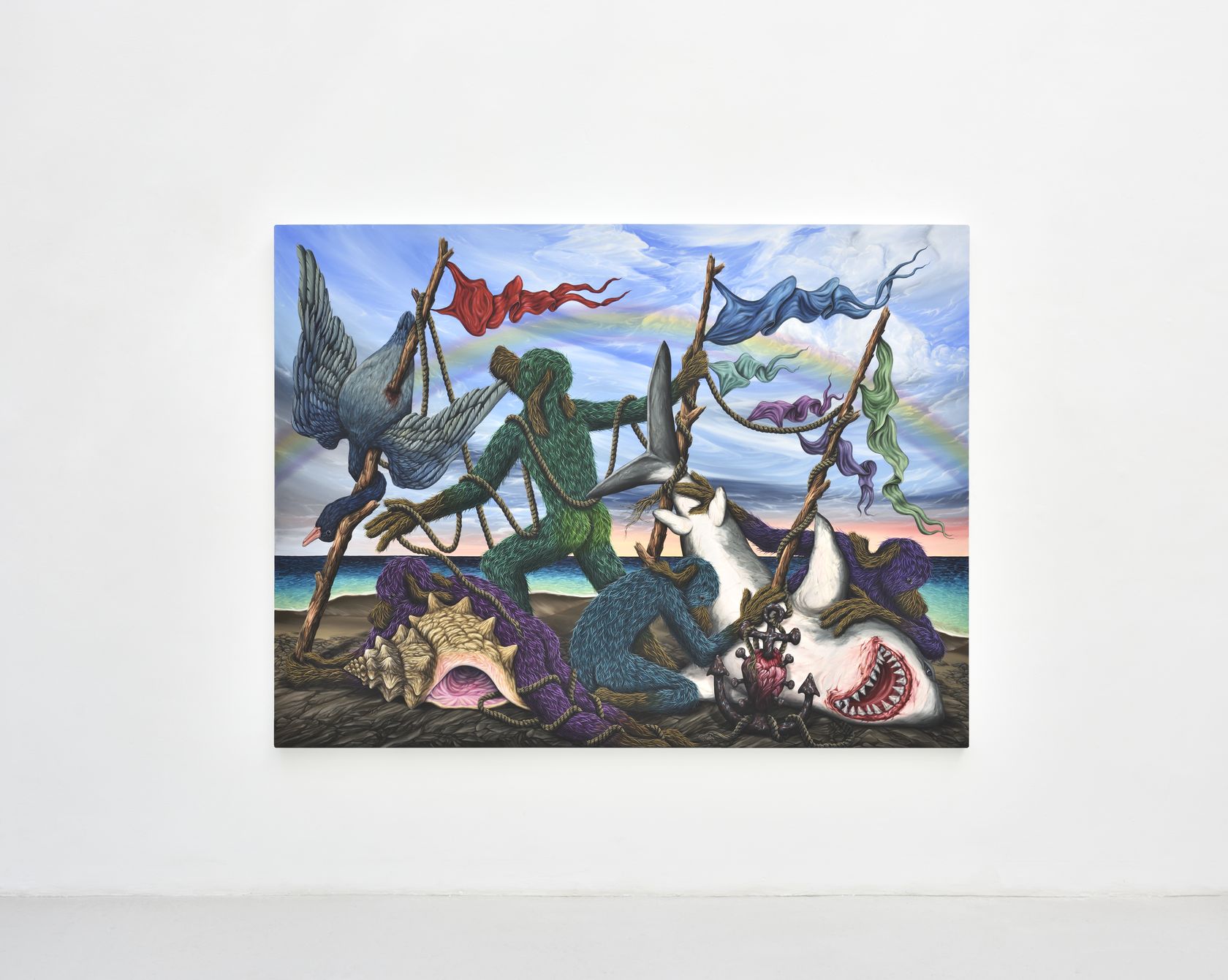 In this new series, the formats—already large in his previous painting where the figures were at least life-sized—are even larger. New creatures appear, winged or chthonian, sharks or alligators. The figures retain their invariable characteristics, such as droopy ears, two color contrasts, the absence of visible genitalia or hands with four fingers—a feature typical of cartoon characters—they do however gain wings then horns, in successive transmutations. The paintings are laid out as potential narratives—initiatory, mythological (Ovid’s Metamorphoses are never very far away) and are essentially ambiguous.