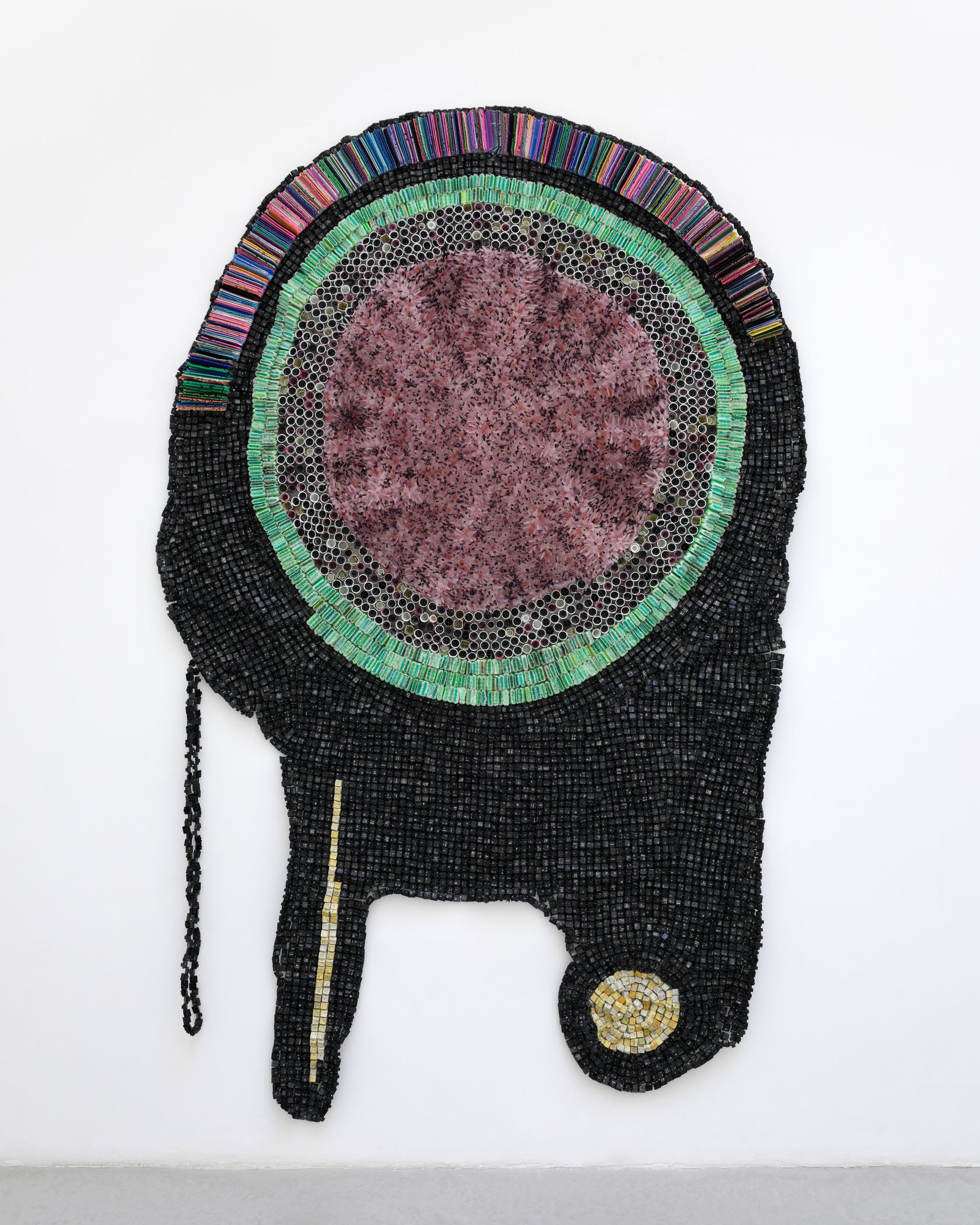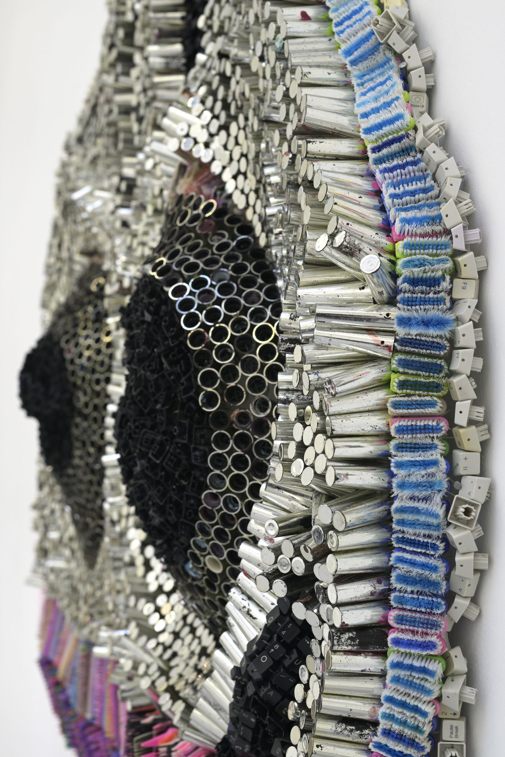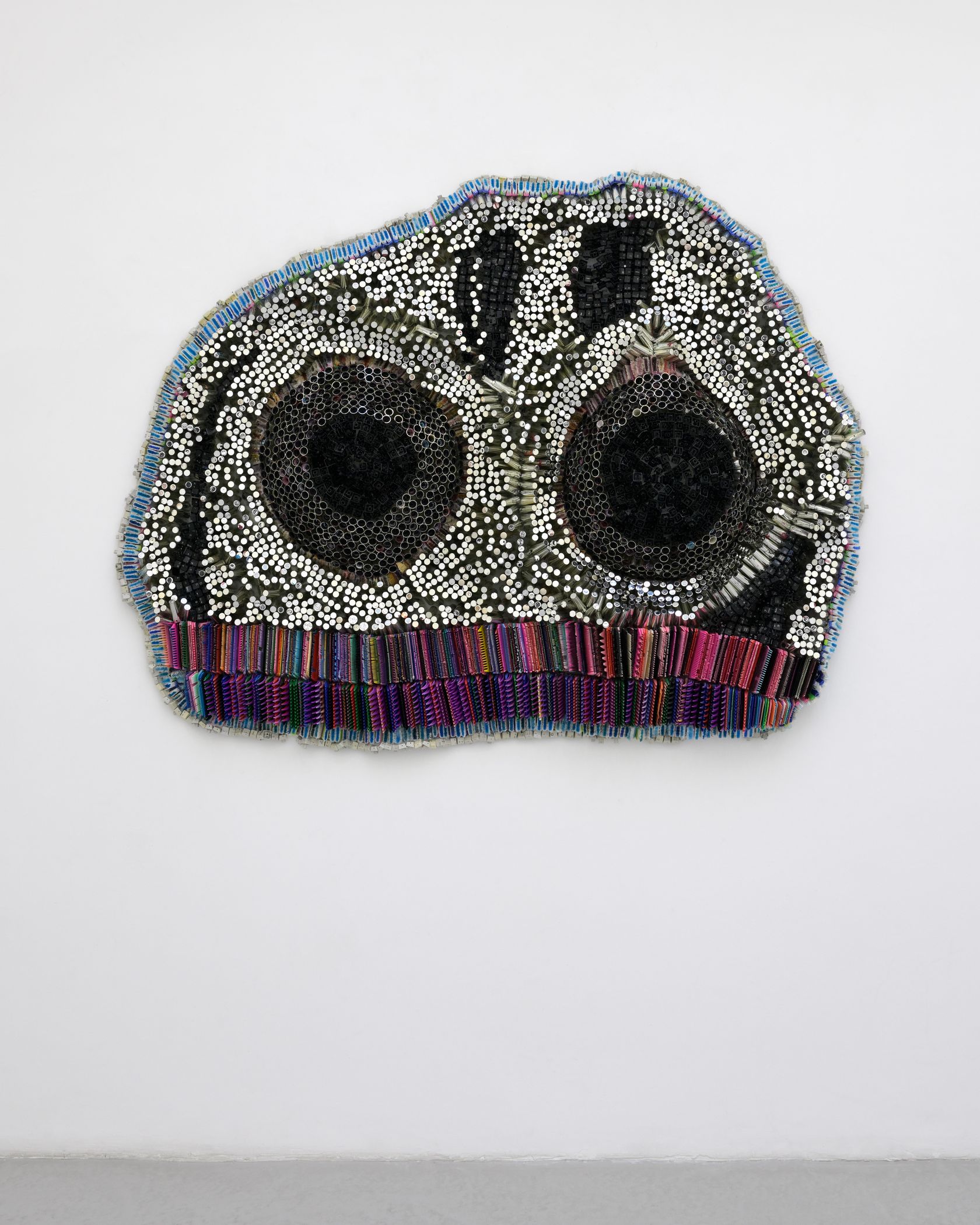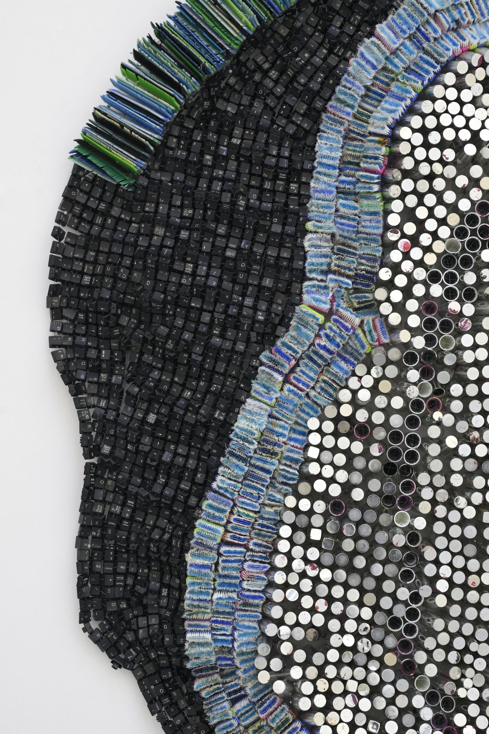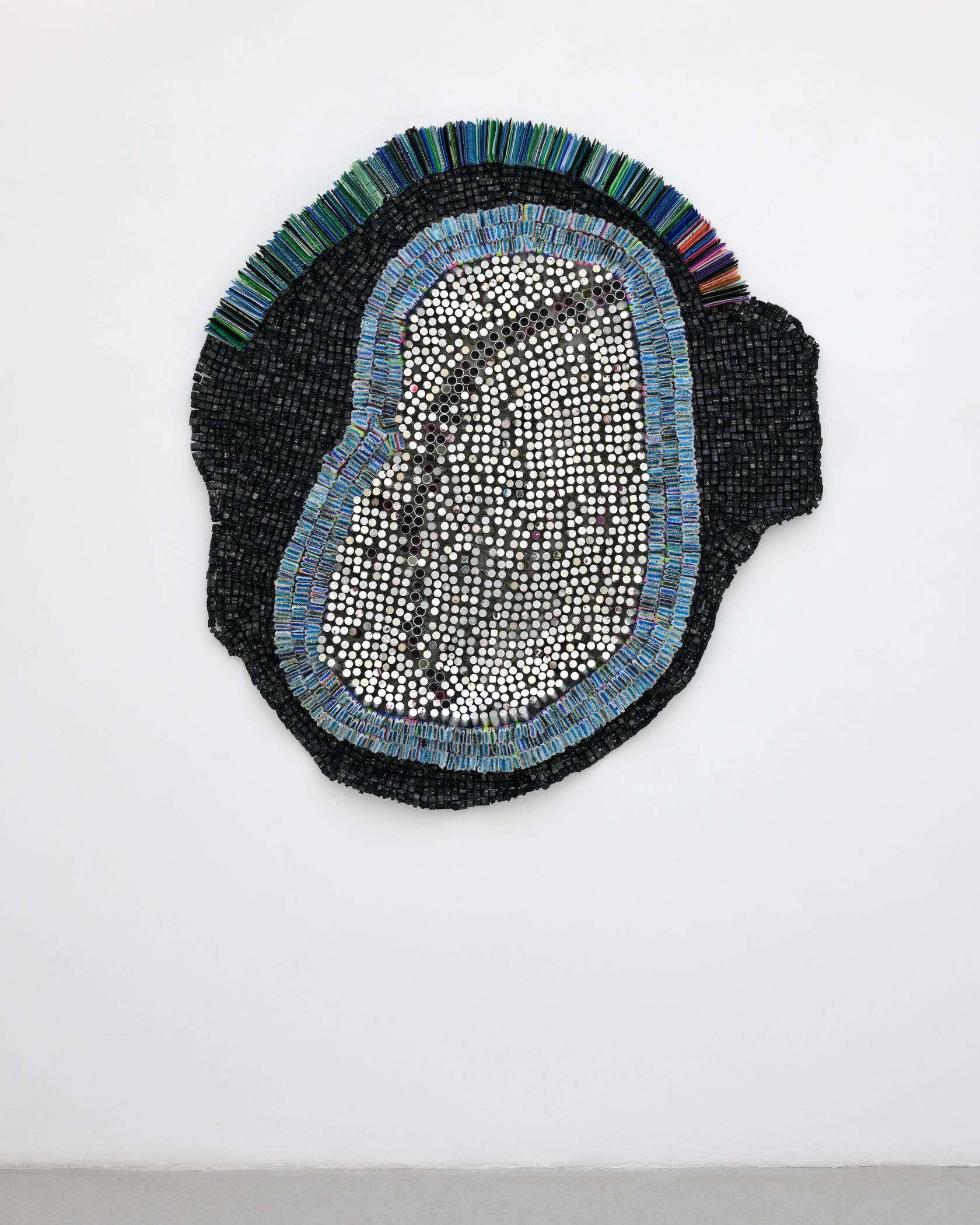 Moffat Takadiwa creates large format sculptures from materials found on garbage dumps, notably computer parts, plastic bottle-caps, toothbrushes and toothpaste tubes. After gathering great quantities of these objects and sorting them by color and shape, the artist weaves these discarded scraps into rich wall hangings. Once suspended, these post-industrial fabrics, through their intricate beauty, acquire an aura of ritual or totemic artifacts.