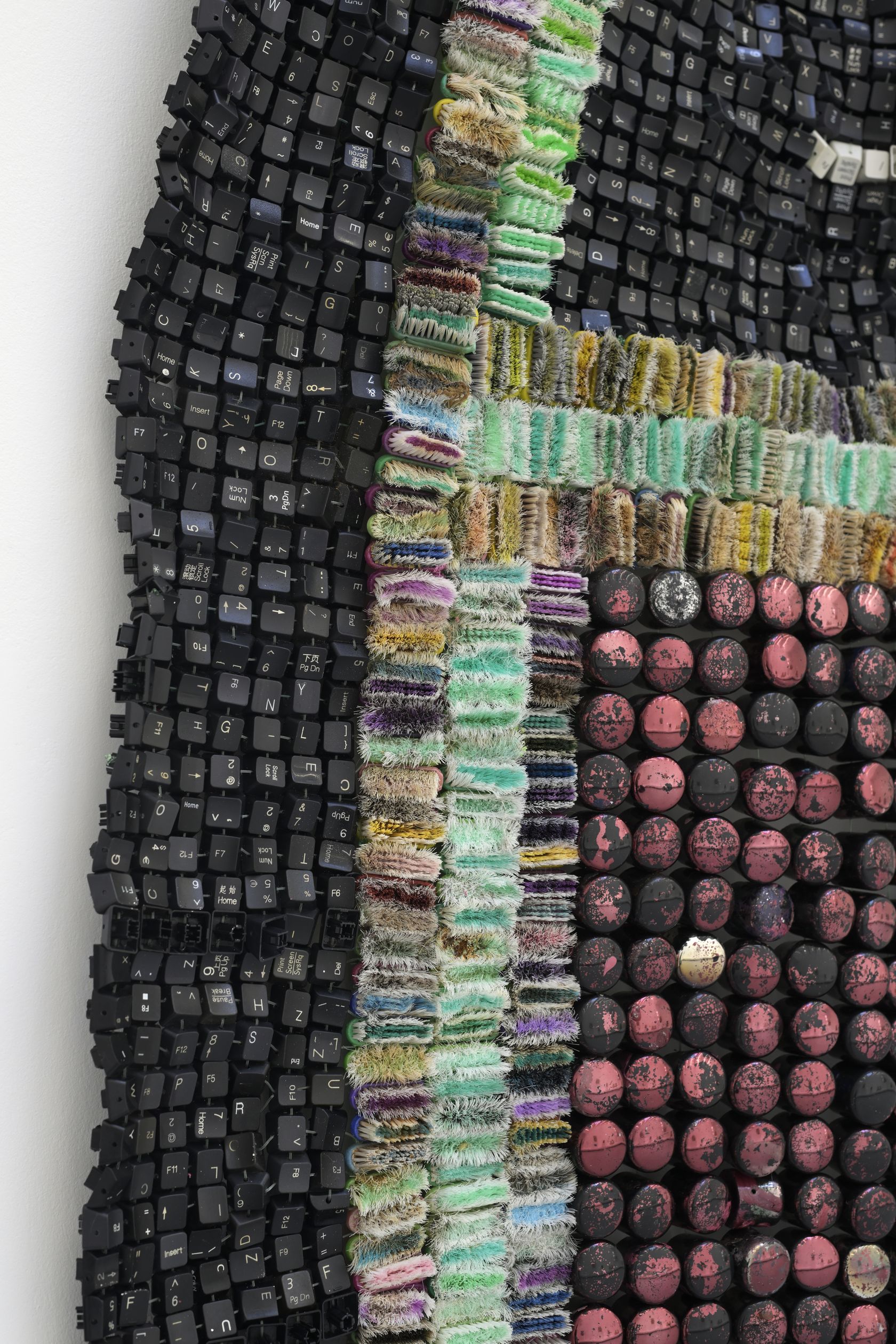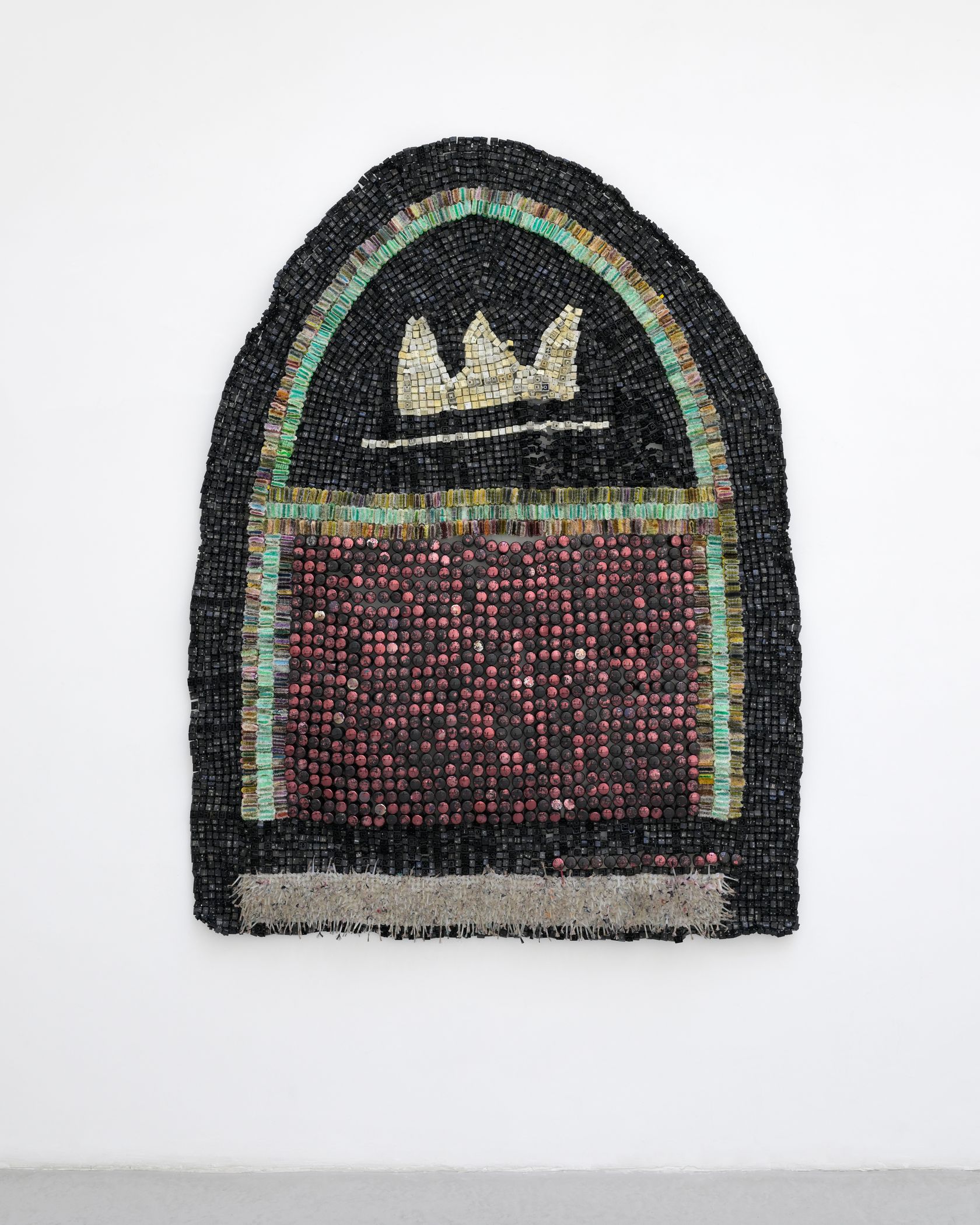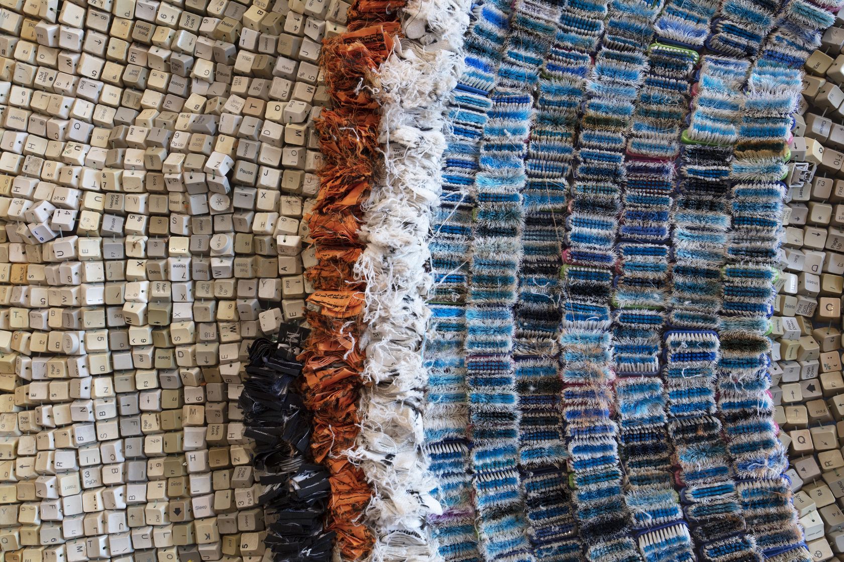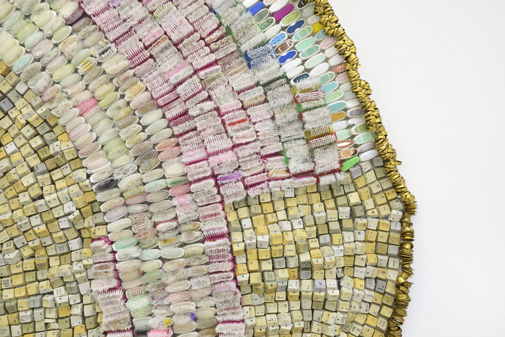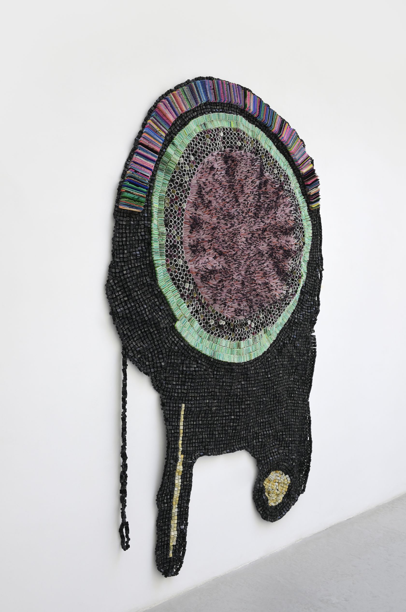 Moffat Takadiwa creates large format sculptures from materials found on garbage dumps, notably computer parts, plastic bottle-caps, toothbrushes and toothpaste tubes. After gathering great quantities of these objects and sorting them by color and shape, the artist weaves these discarded scraps into rich wall hangings. Once suspended, these post-industrial fabrics, through their intricate beauty, acquire an aura of ritual or totemic artifacts.