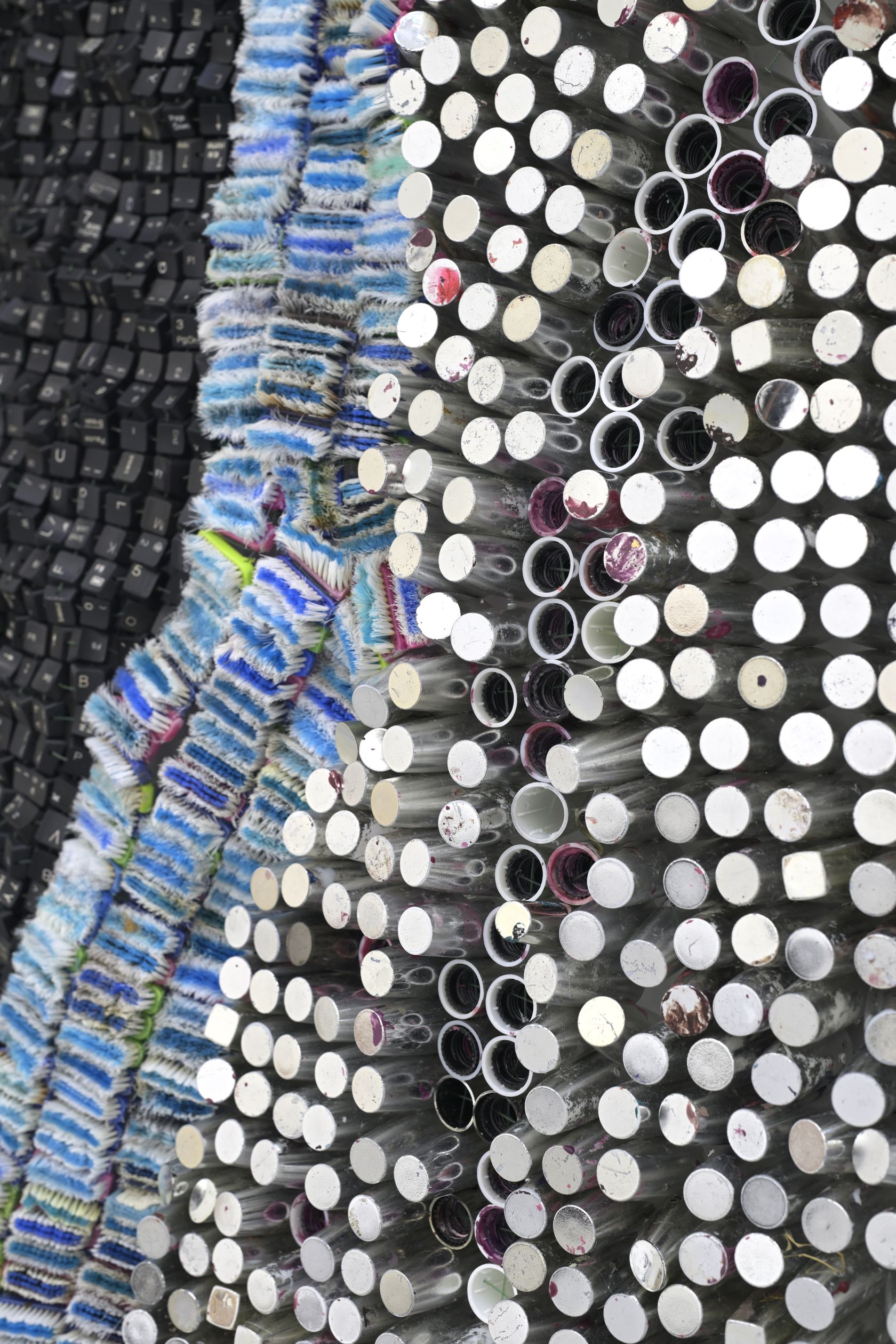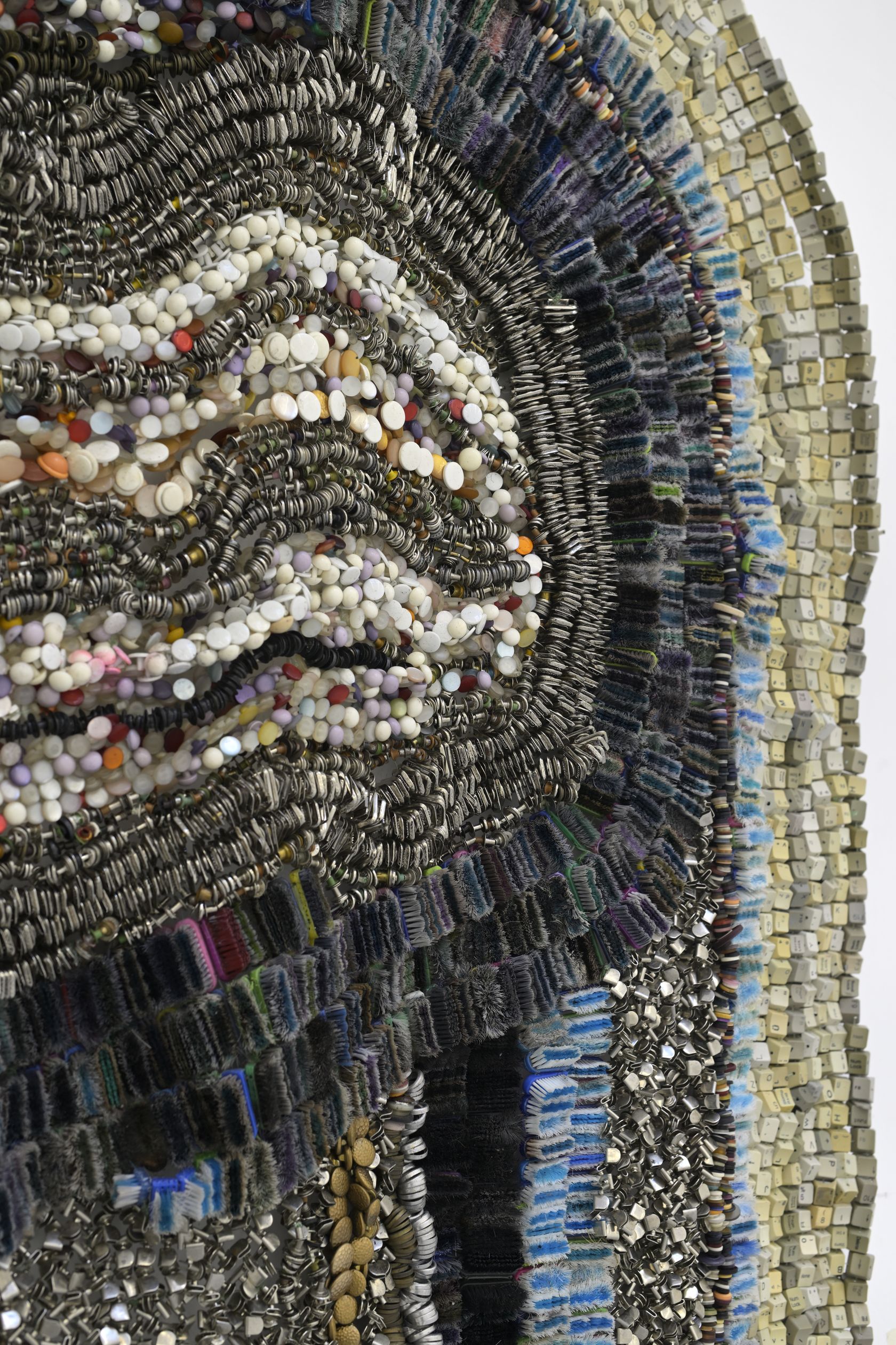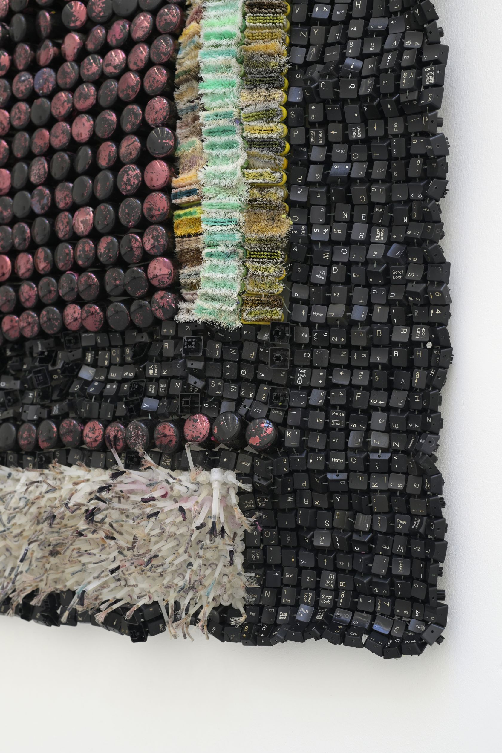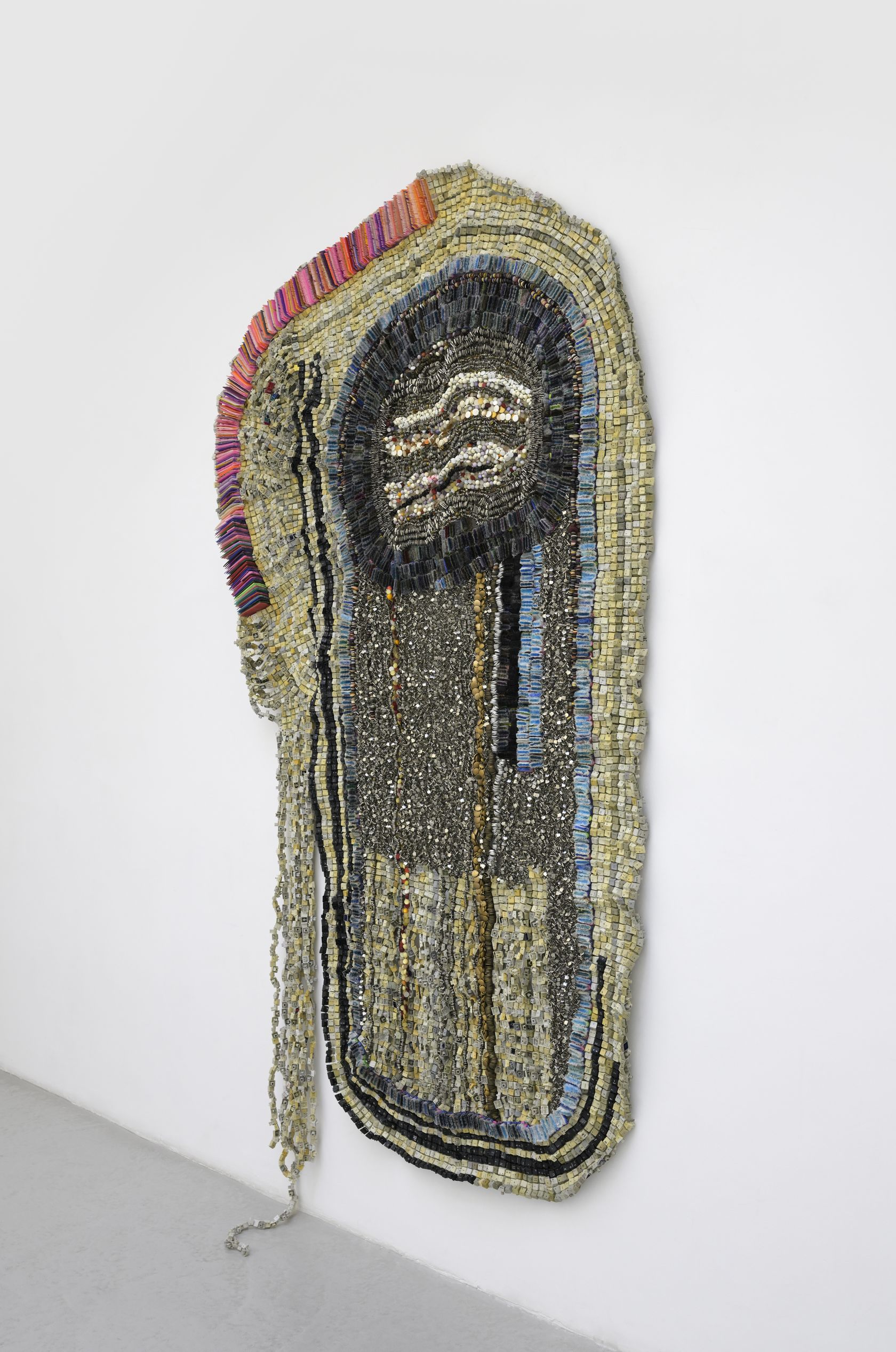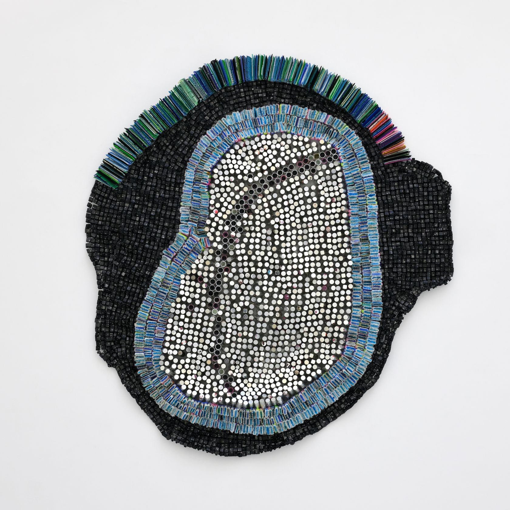 Moffat Takadiwa creates large format sculptures from materials found on garbage dumps, notably computer parts, plastic bottle-caps, toothbrushes and toothpaste tubes. After gathering great quantities of these objects and sorting them by color and shape, the artist weaves these discarded scraps into rich wall hangings. Once suspended, these post-industrial fabrics, through their intricate beauty, acquire an aura of ritual or totemic artifacts.