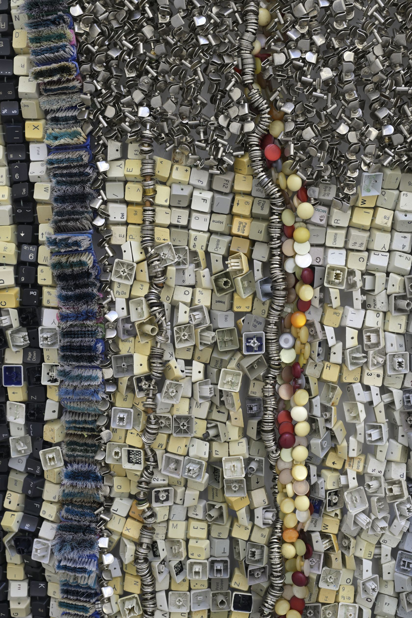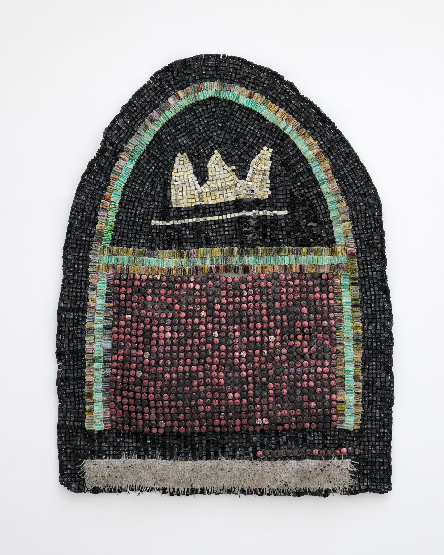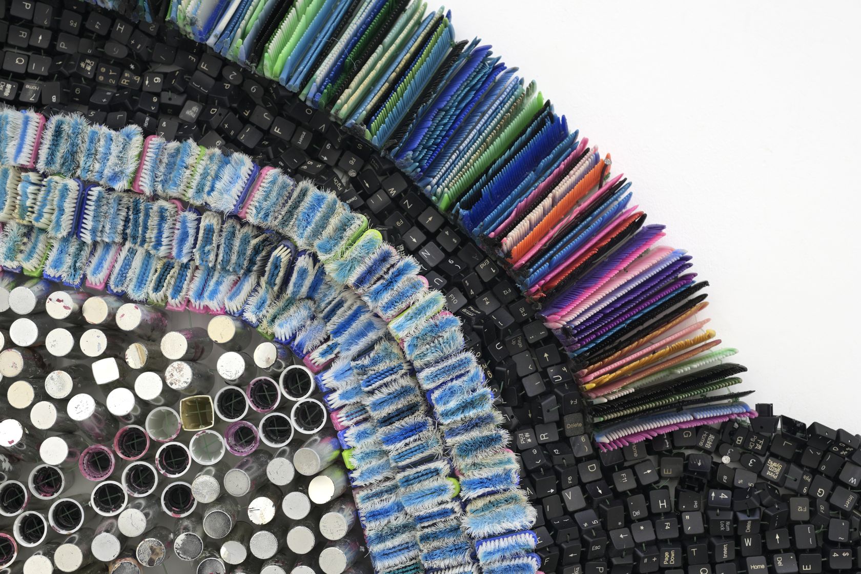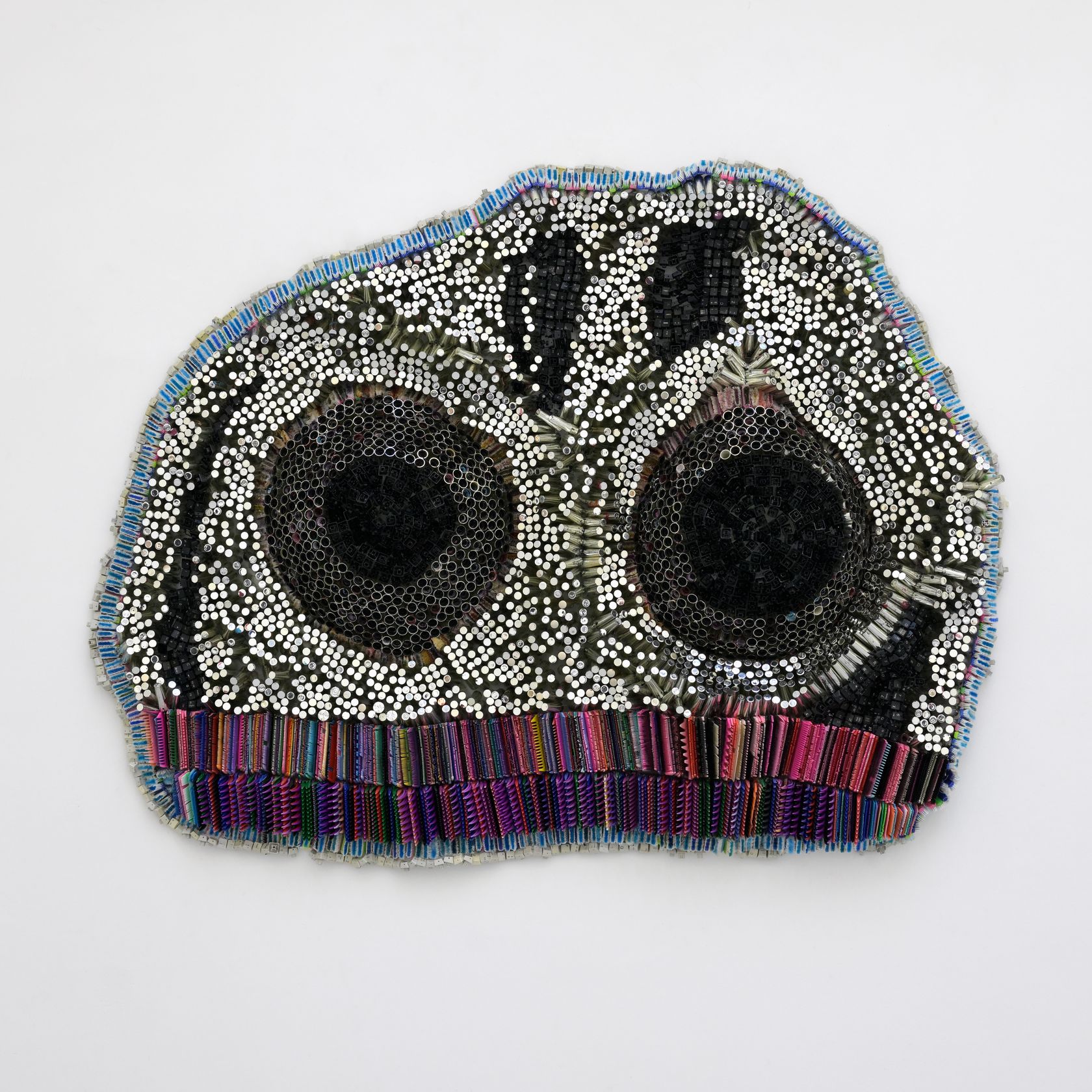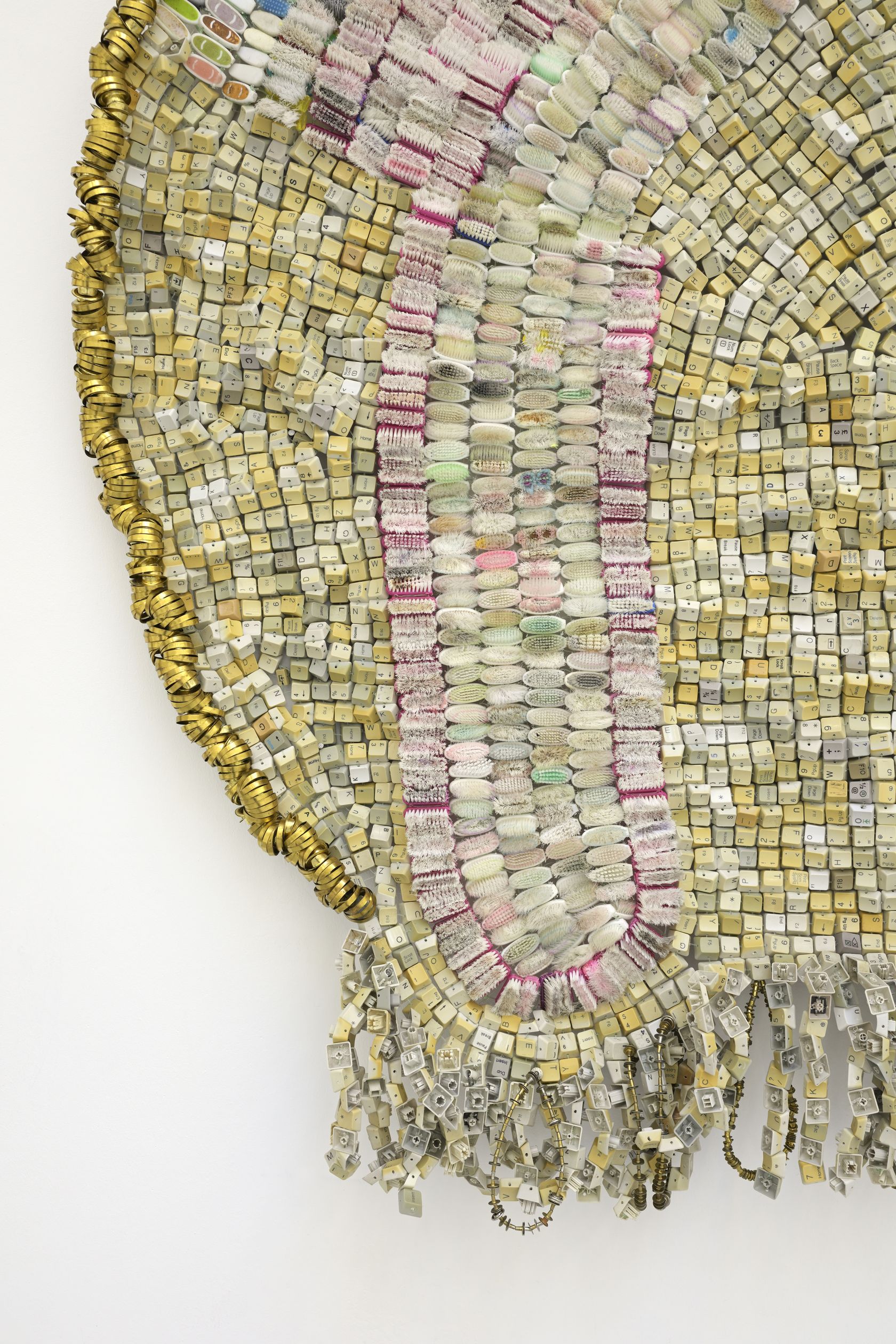Moffat Takadiwa creates large format sculptures from materials found on garbage dumps, notably computer parts, plastic bottle-caps, toothbrushes and toothpaste tubes. After gathering great quantities of these objects and sorting them by color and shape, the artist weaves these discarded scraps into rich wall hangings. Once suspended, these post-industrial fabrics, through their intricate beauty, acquire an aura of ritual or totemic artifacts.