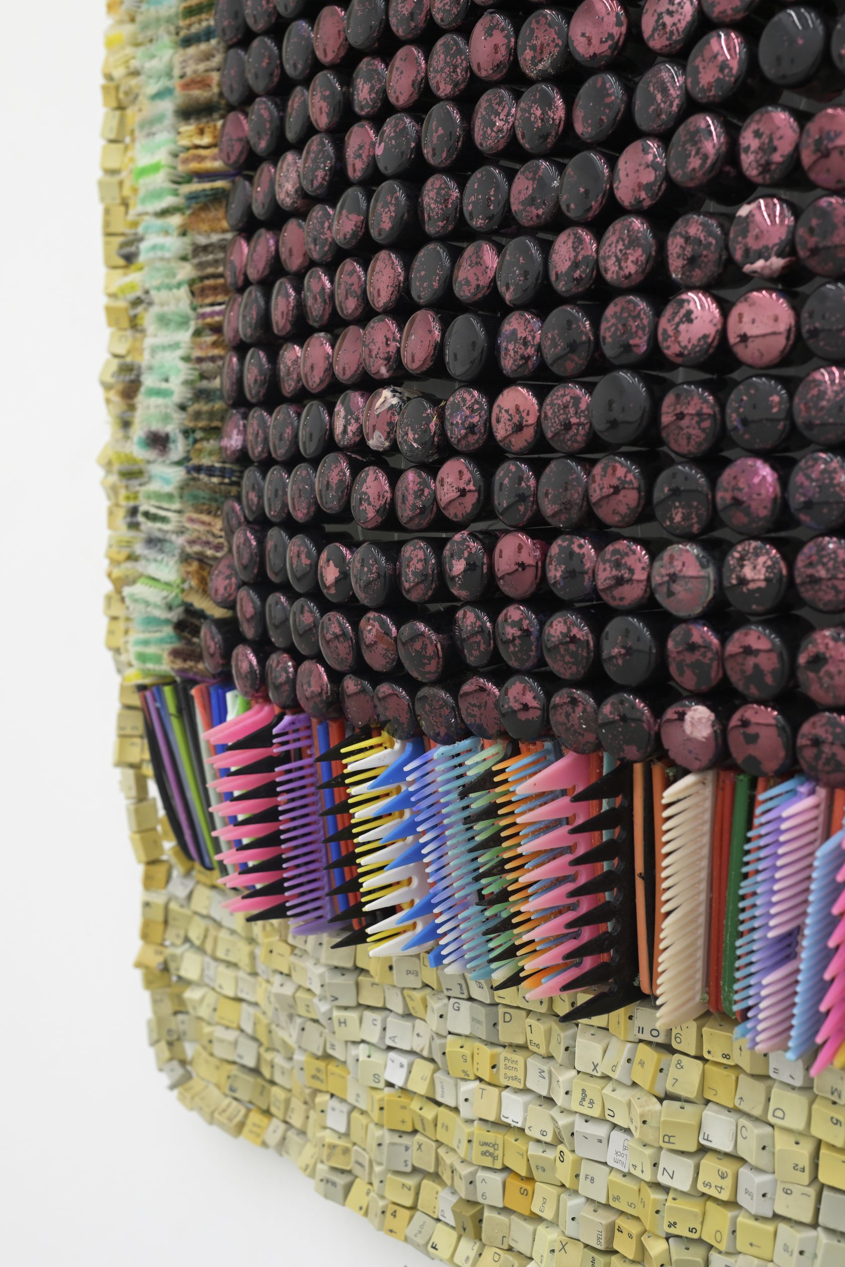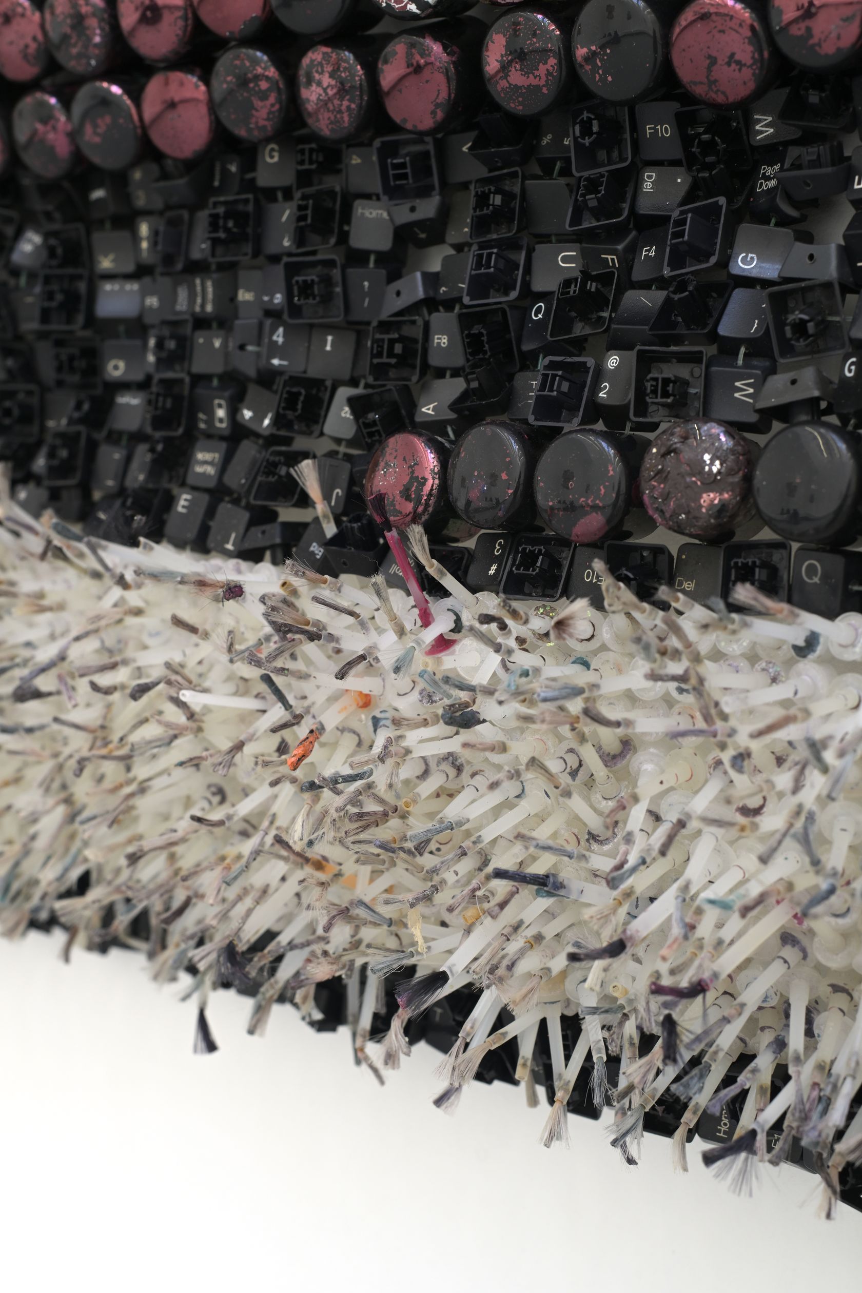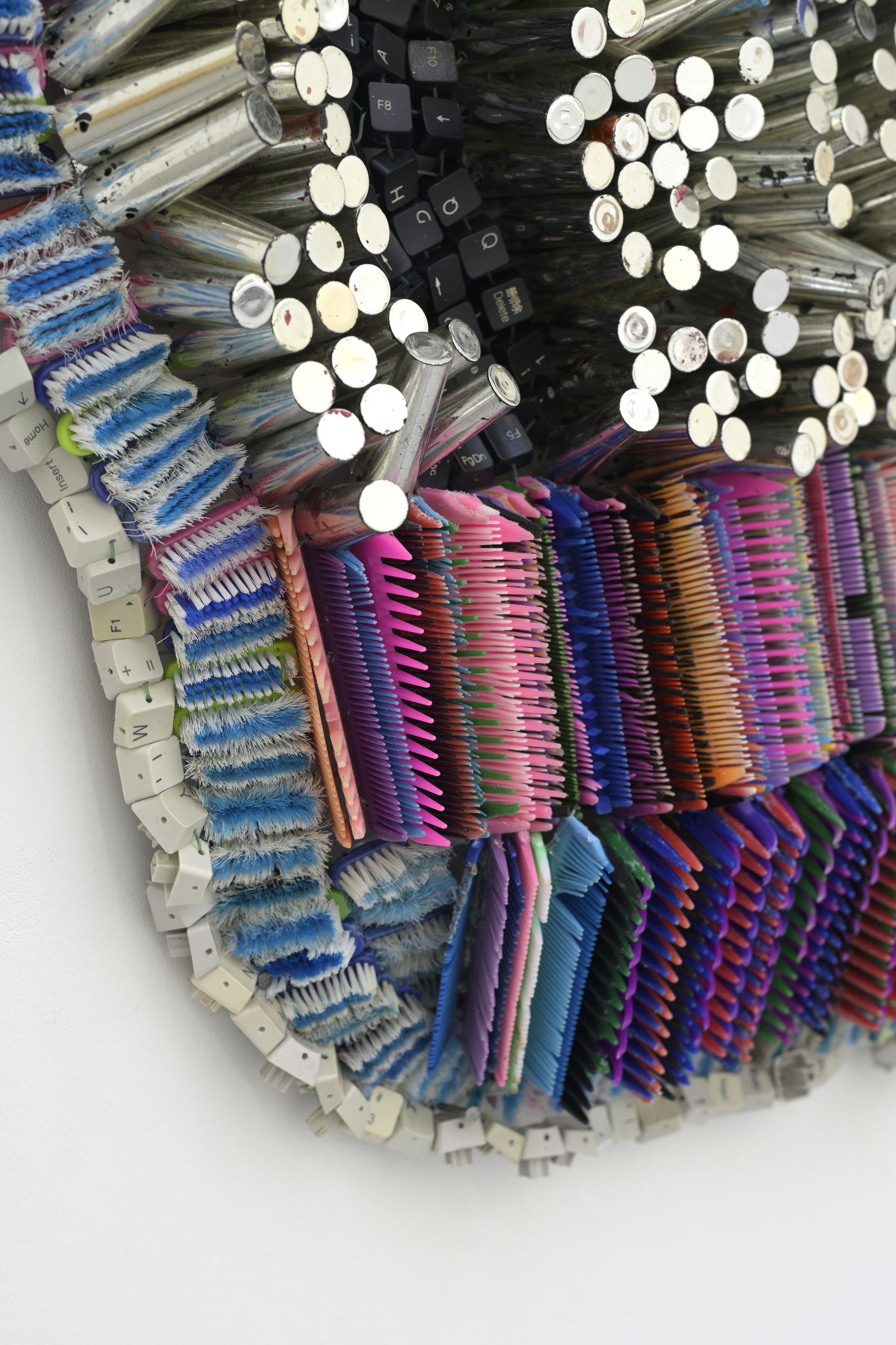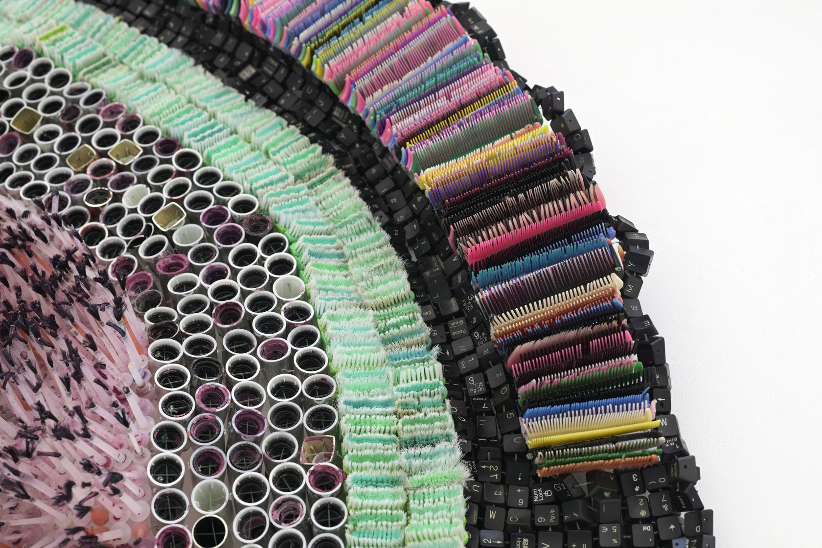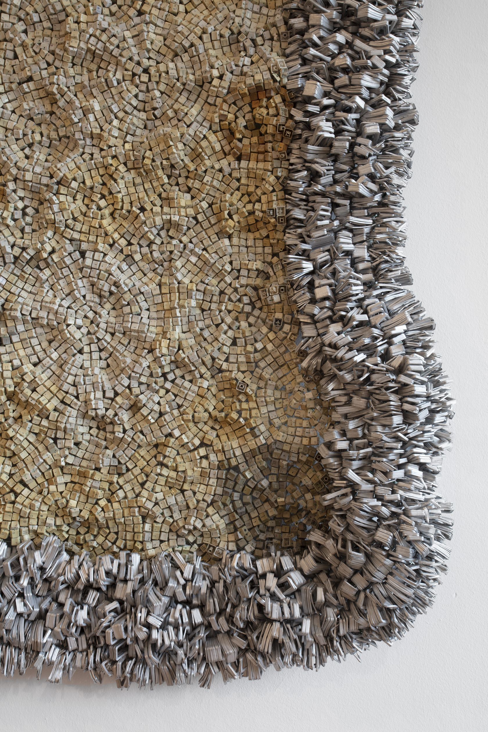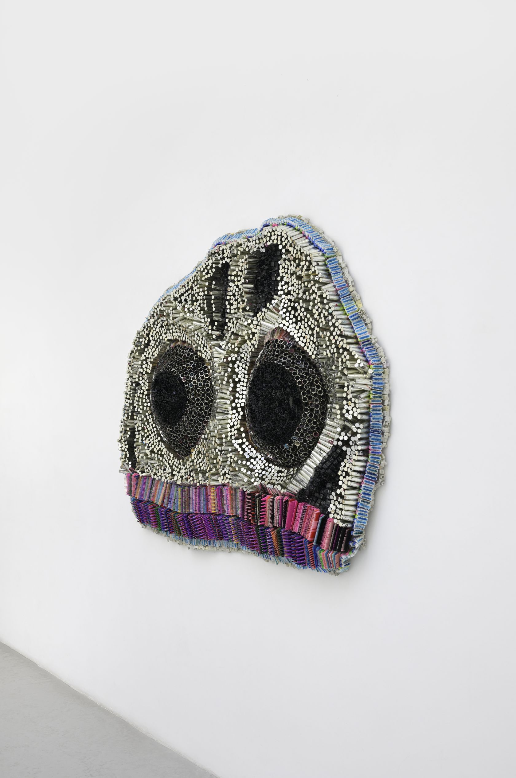 Moffat Takadiwa creates large format sculptures from materials found on garbage dumps, notably computer parts, plastic bottle-caps, toothbrushes and toothpaste tubes. After gathering great quantities of these objects and sorting them by color and shape, the artist weaves these discarded scraps into rich wall hangings. Once suspended, these post-industrial fabrics, through their intricate beauty, acquire an aura of ritual or totemic artifacts.