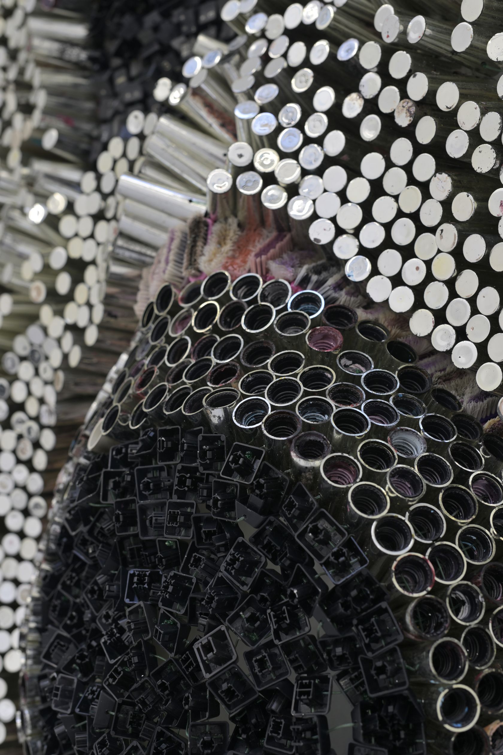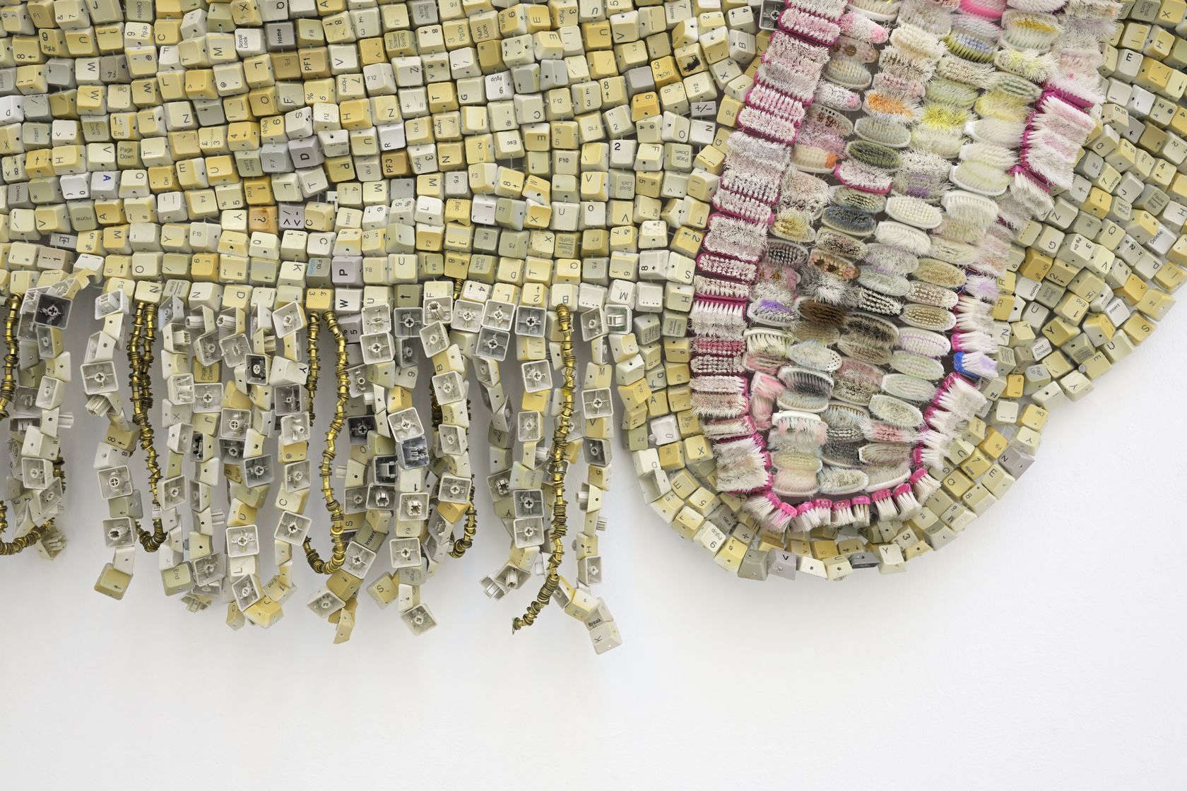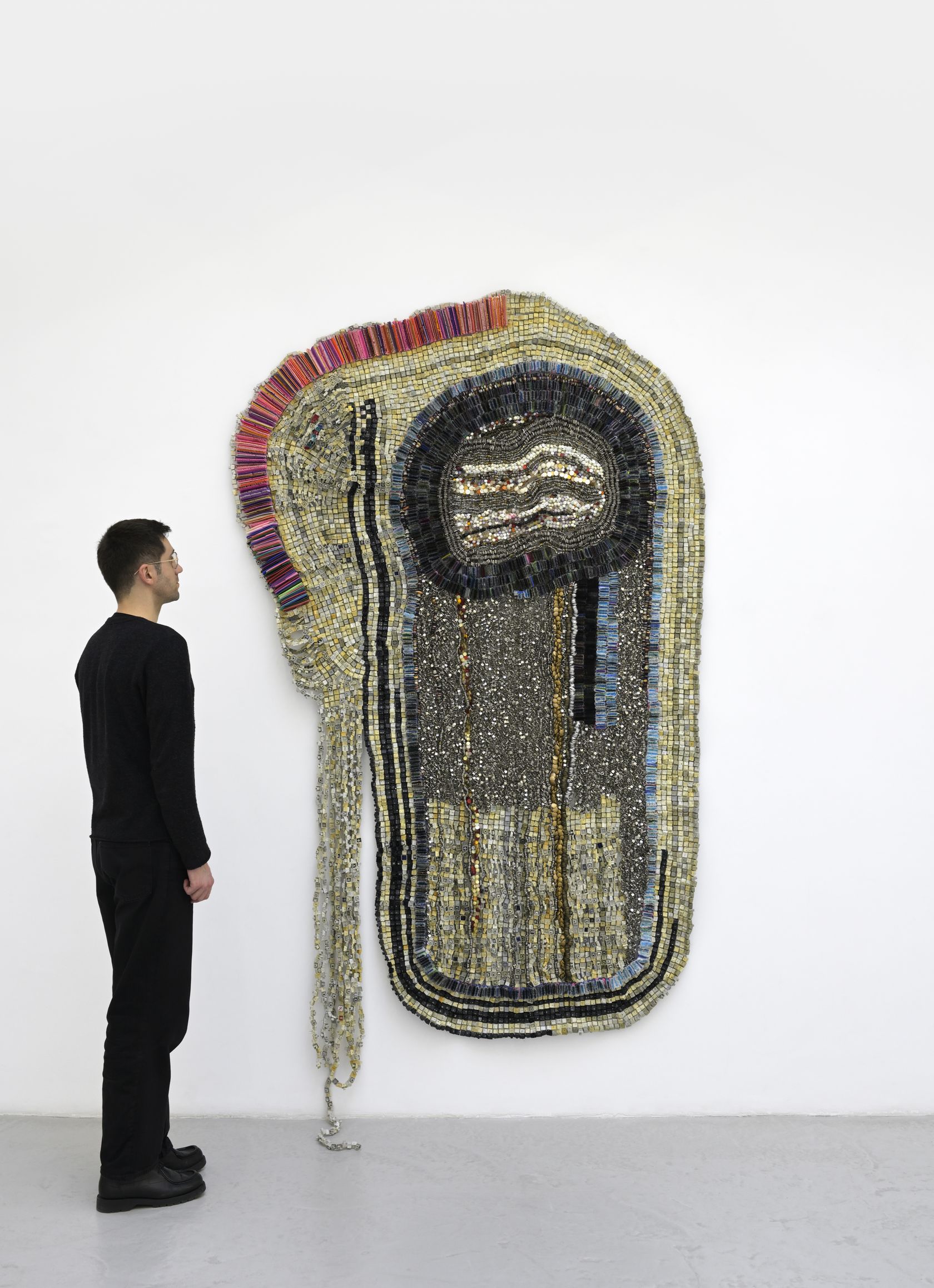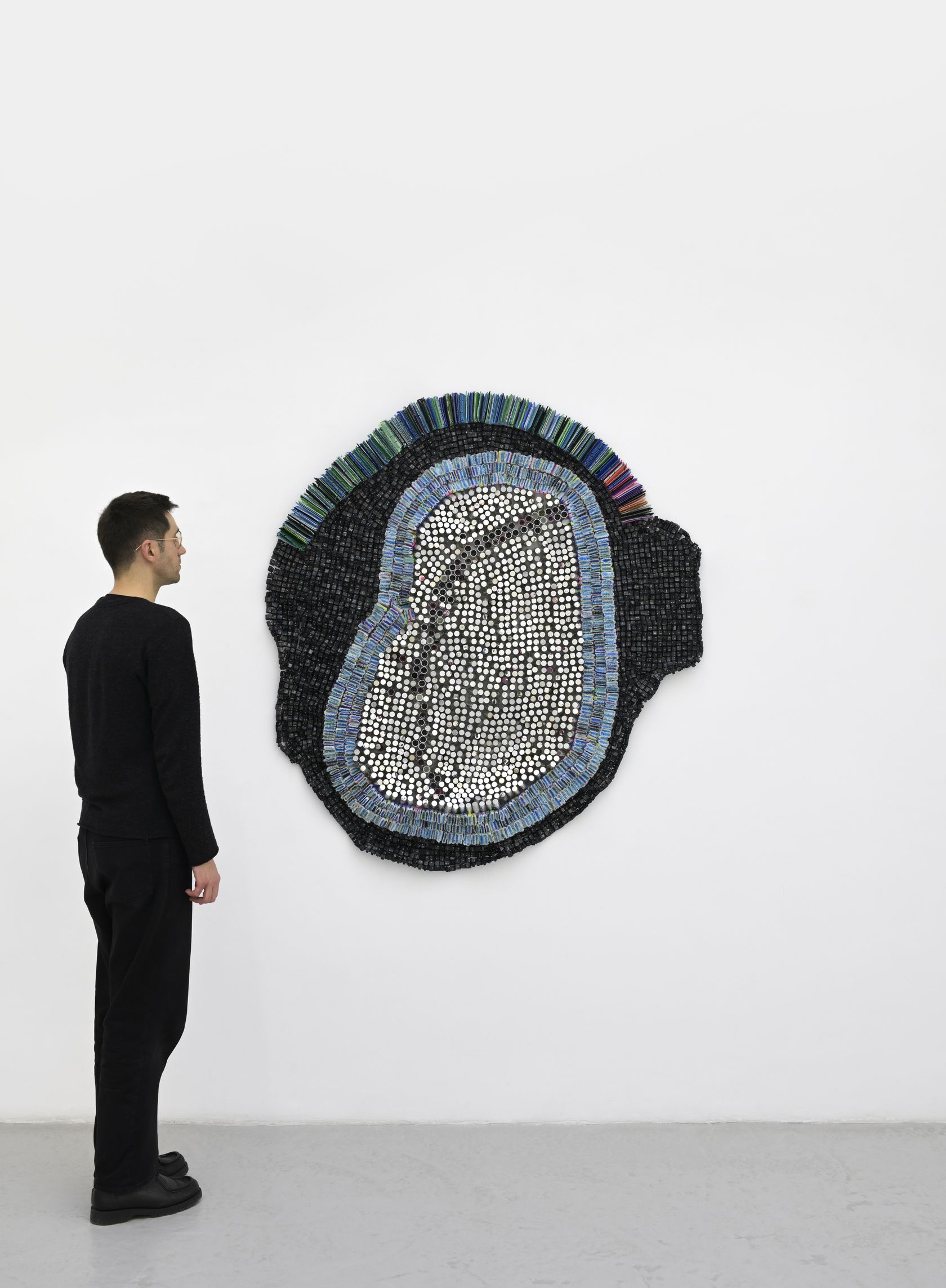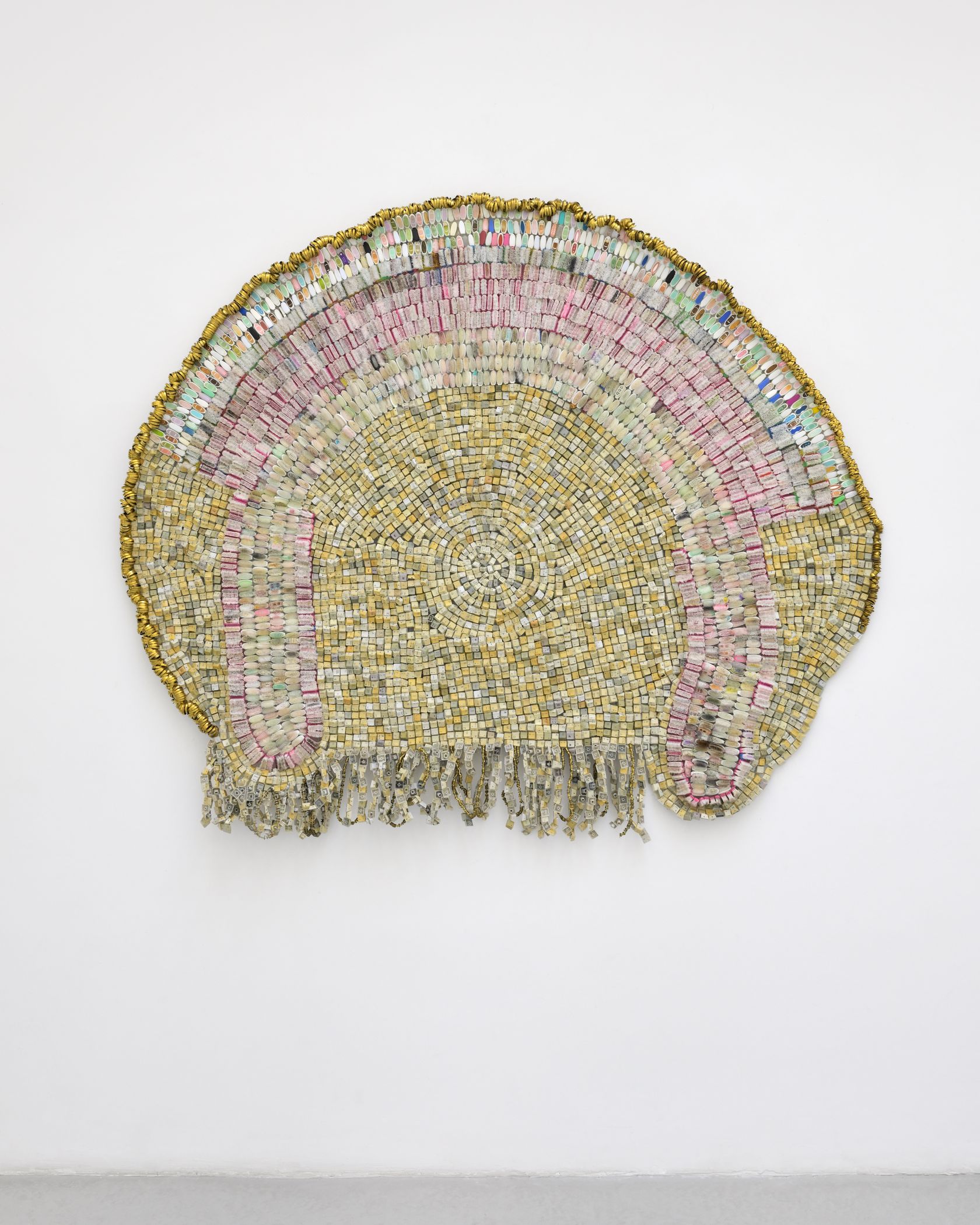 Moffat Takadiwa creates large format sculptures from materials found on garbage dumps, notably computer parts, plastic bottle-caps, toothbrushes and toothpaste tubes. After gathering great quantities of these objects and sorting them by color and shape, the artist weaves these discarded scraps into rich wall hangings. Once suspended, these post-industrial fabrics, through their intricate beauty, acquire an aura of ritual or totemic artifacts.