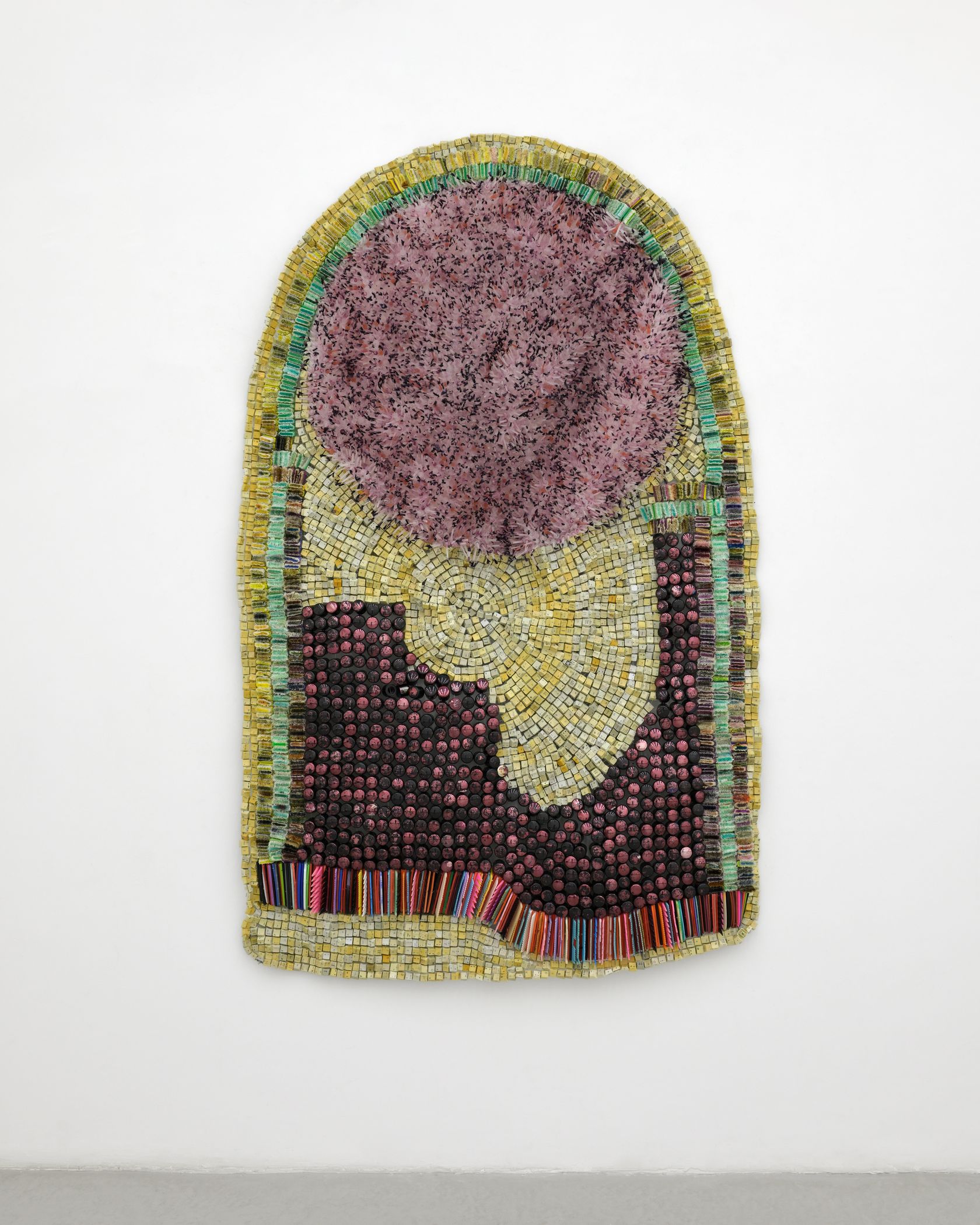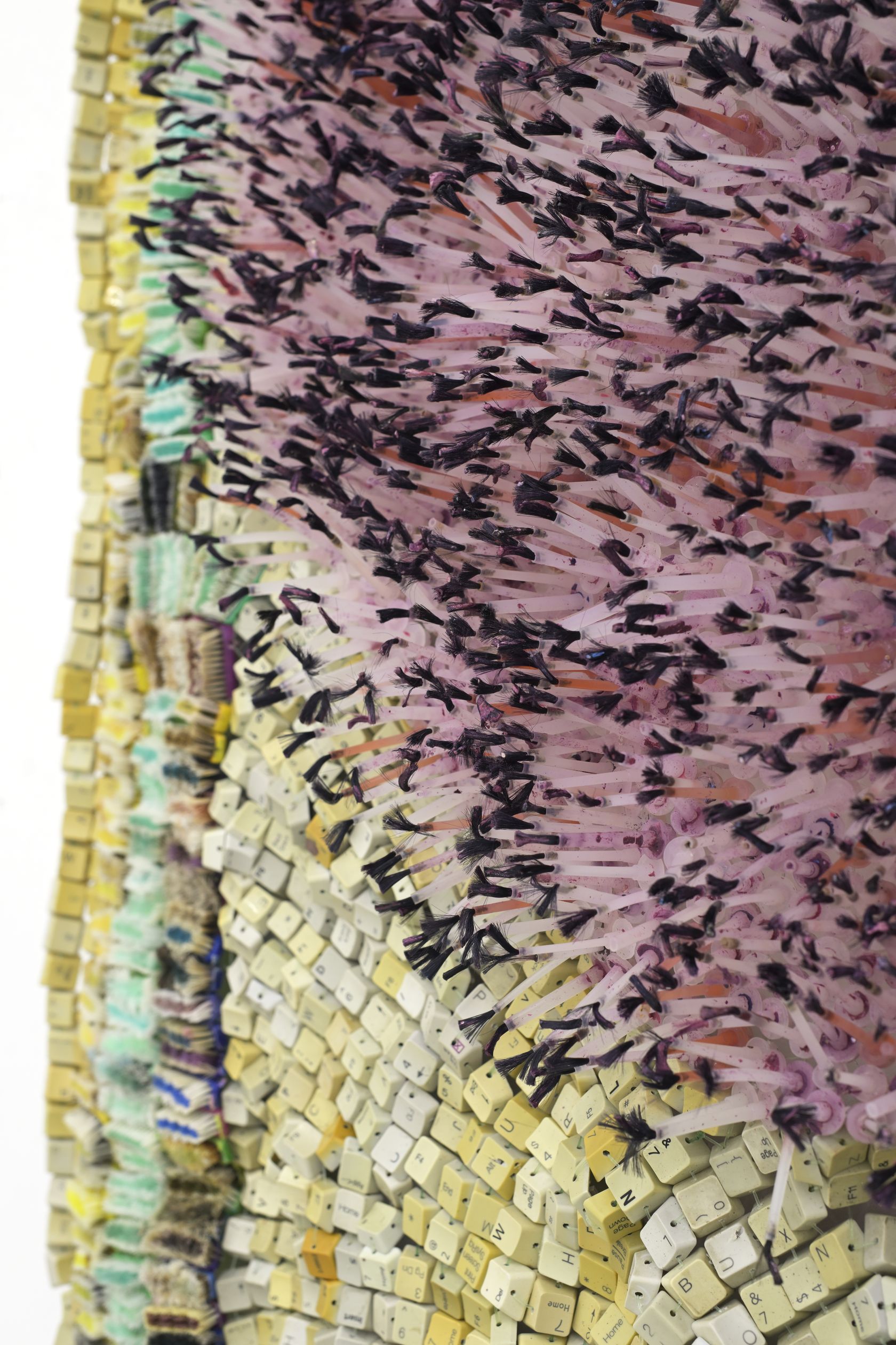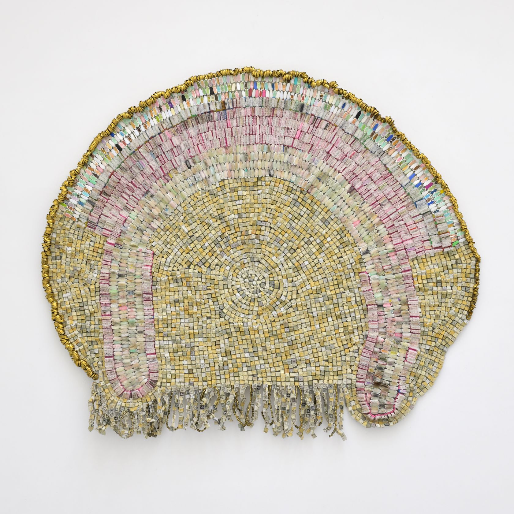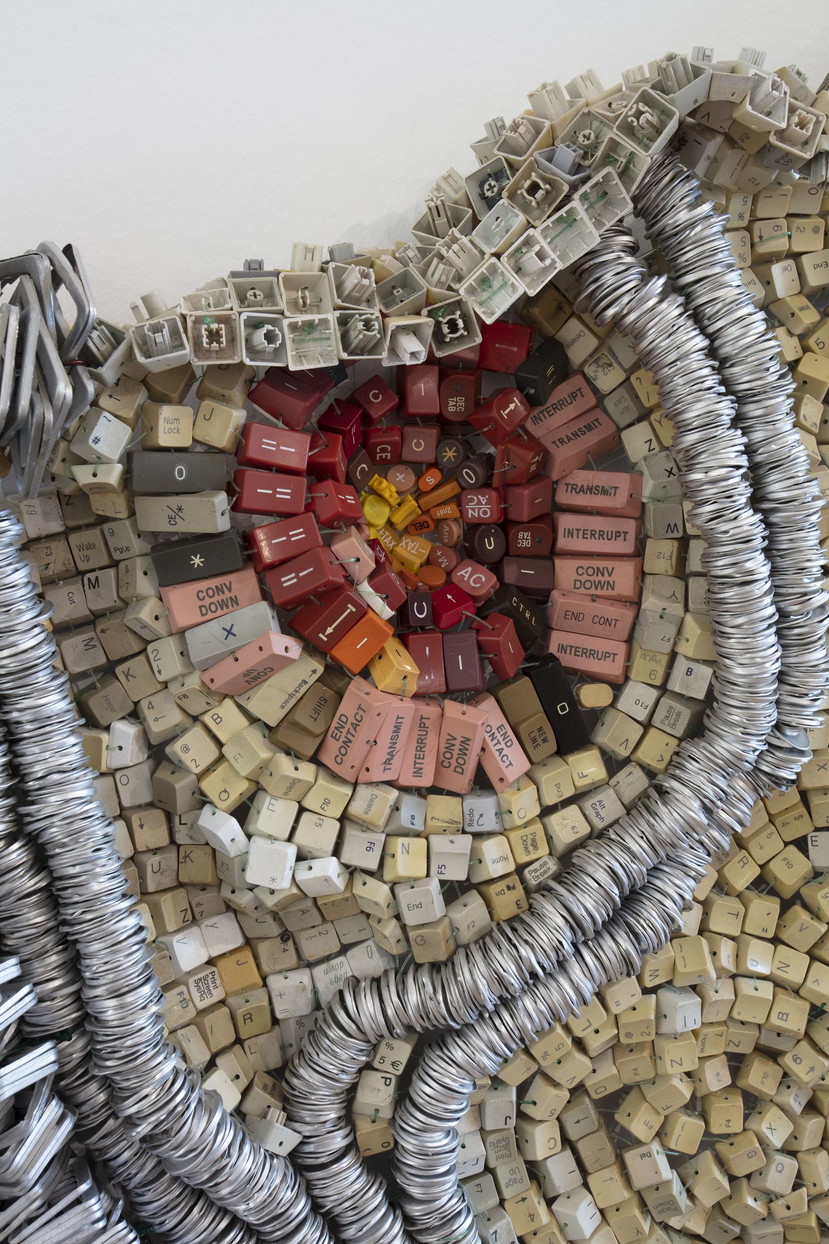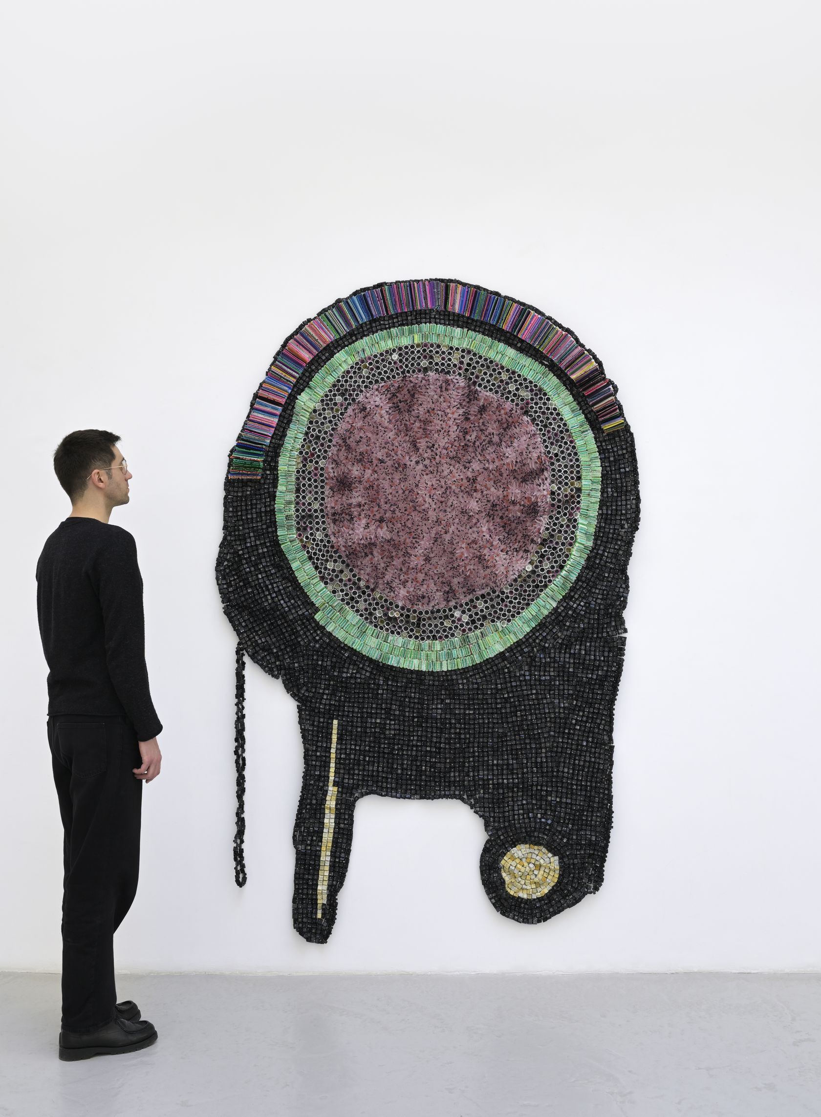 Moffat Takadiwa creates large format sculptures from materials found on garbage dumps, notably computer parts, plastic bottle-caps, toothbrushes and toothpaste tubes. After gathering great quantities of these objects and sorting them by color and shape, the artist weaves these discarded scraps into rich wall hangings. Once suspended, these post-industrial fabrics, through their intricate beauty, acquire an aura of ritual or totemic artifacts.