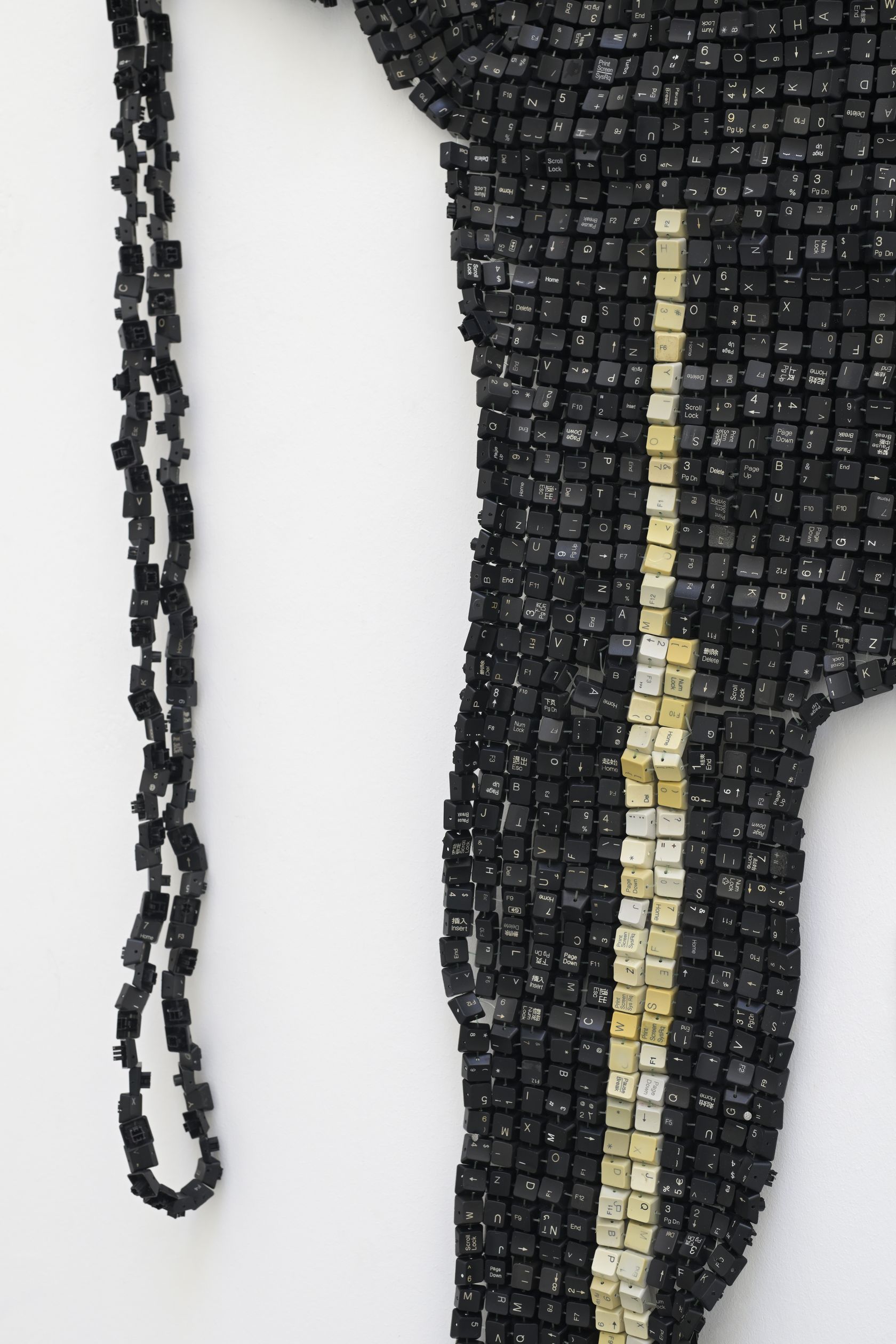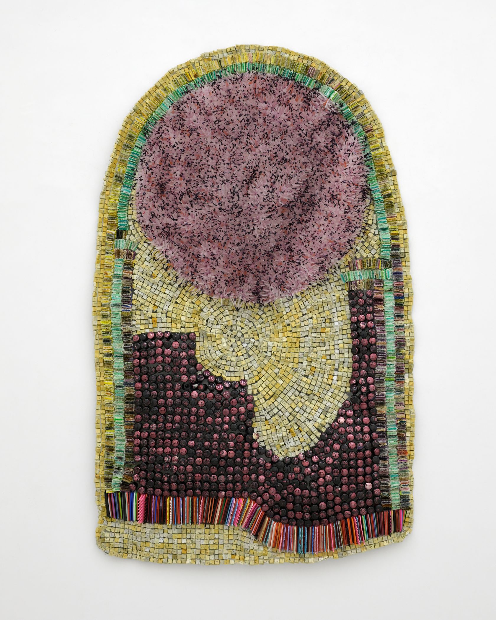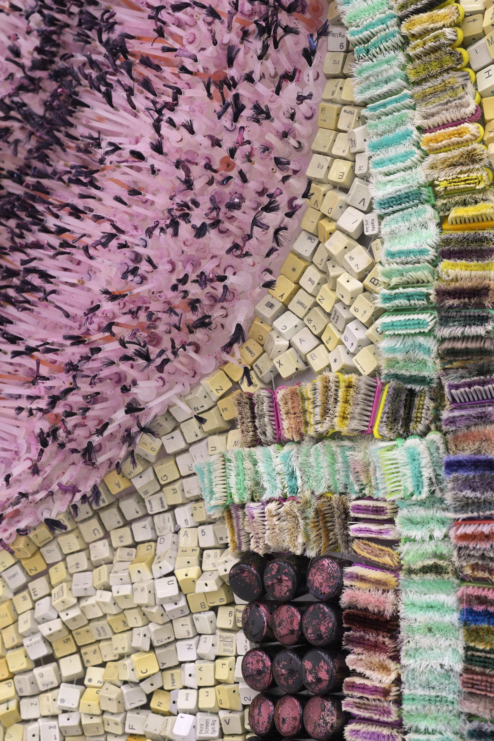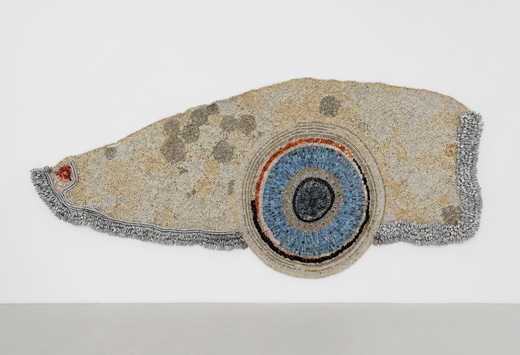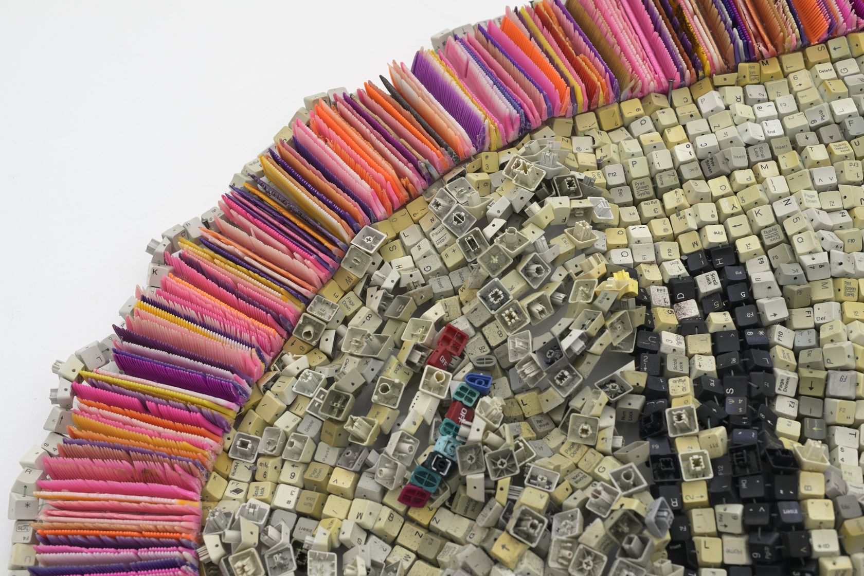 Moffat Takadiwa creates large format sculptures from materials found on garbage dumps, notably computer parts, plastic bottle-caps, toothbrushes and toothpaste tubes. After gathering great quantities of these objects and sorting them by color and shape, the artist weaves these discarded scraps into rich wall hangings. Once suspended, these post-industrial fabrics, through their intricate beauty, acquire an aura of ritual or totemic artifacts.