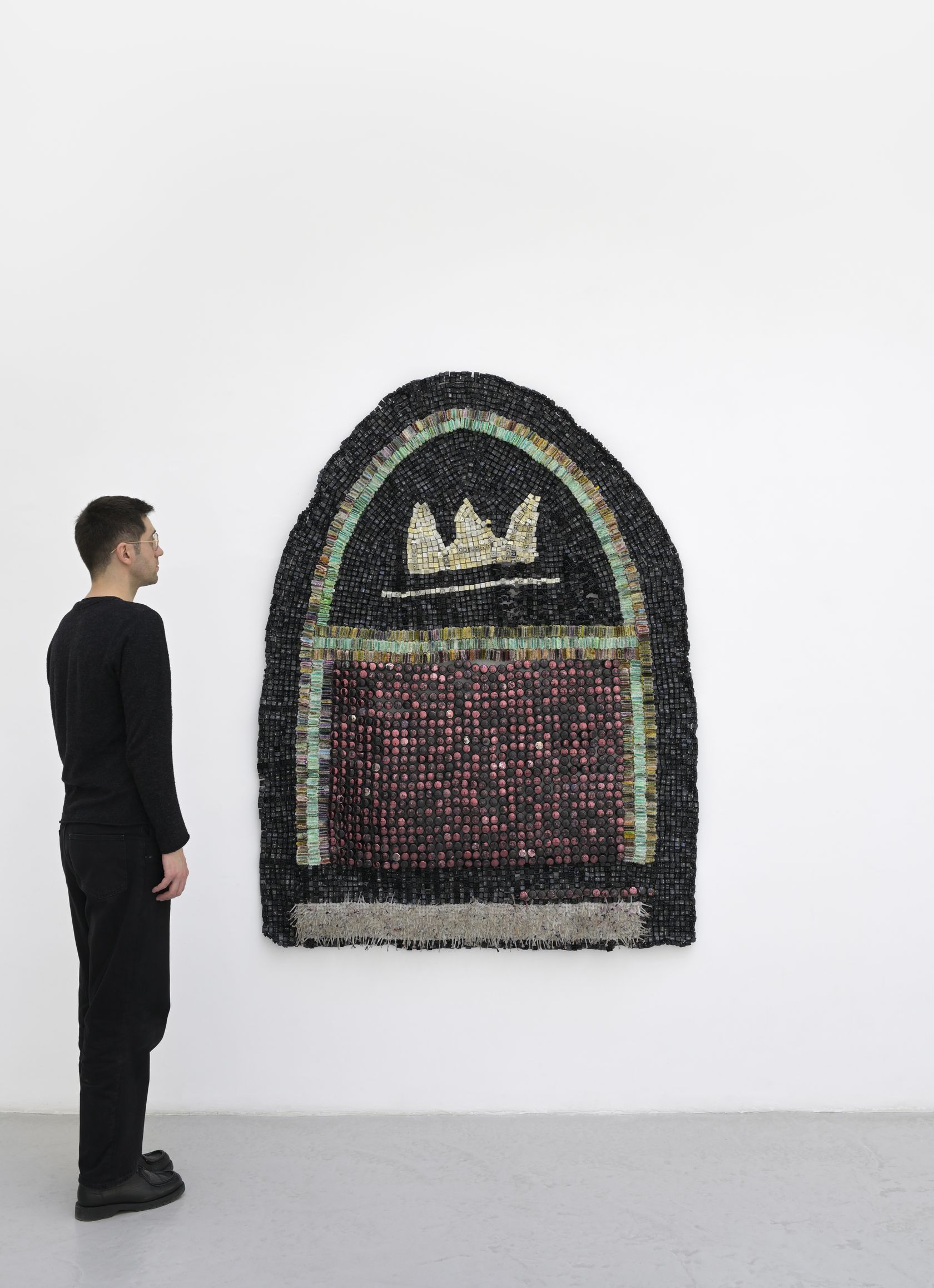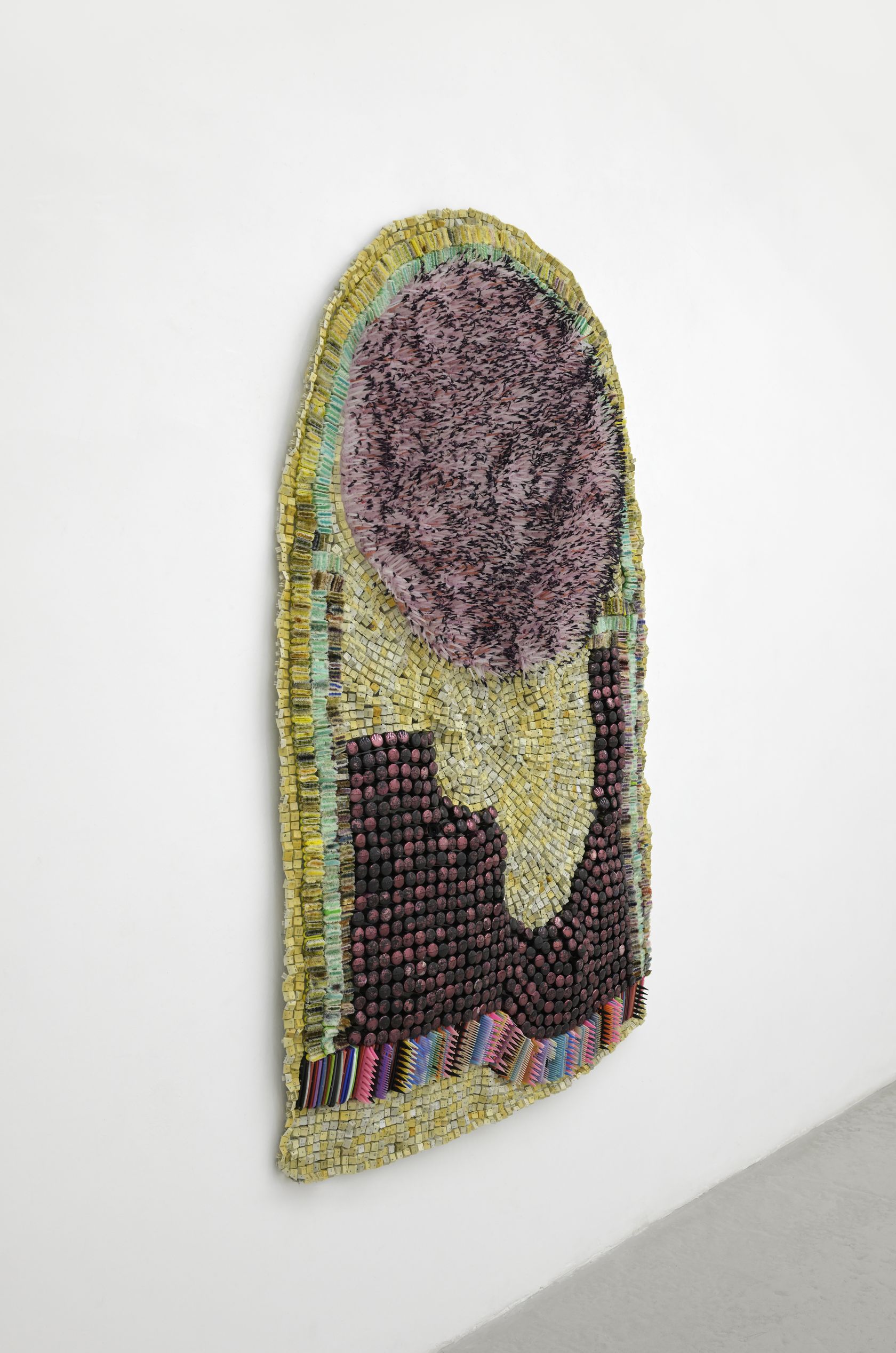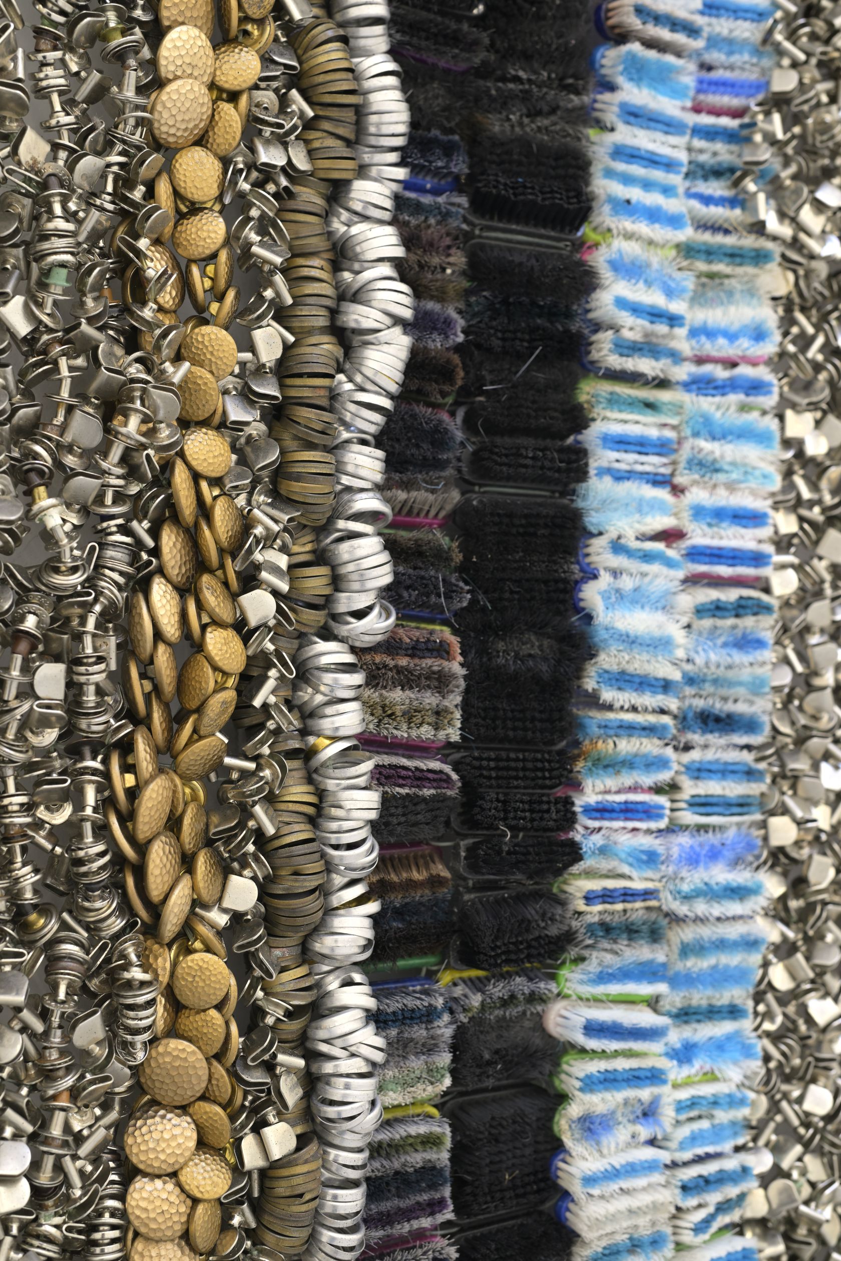 The Crown! pushes Takadiwa’s ongoing project further, reclaiming the leftover traces of everyday things and turning them into what you might call post-industrial textiles. These are not objects of comfort. They carry the tensions of Africa’s post-colonial afterlife: the politics of black hair, the hunger for small vanities, the choreography of conspicuous consumption. Afro combs, which appear throughout the show, serve as archives of social, political, and spiritual history, rooted in African traditions and the colonial self-fashioning they forced. Once tools for grooming and ritual, these combs now bear the weight of resistance and pride in Black political life.
