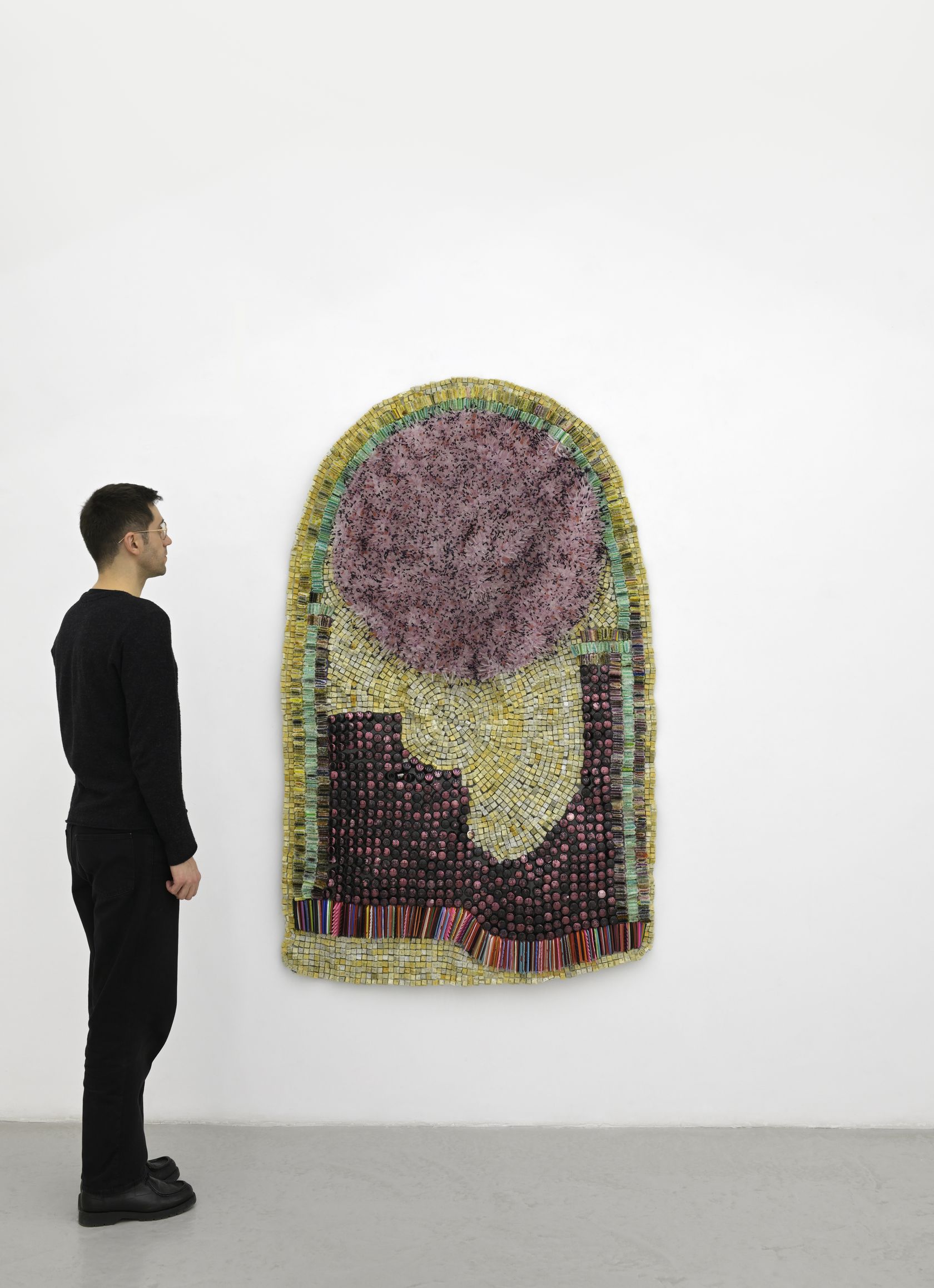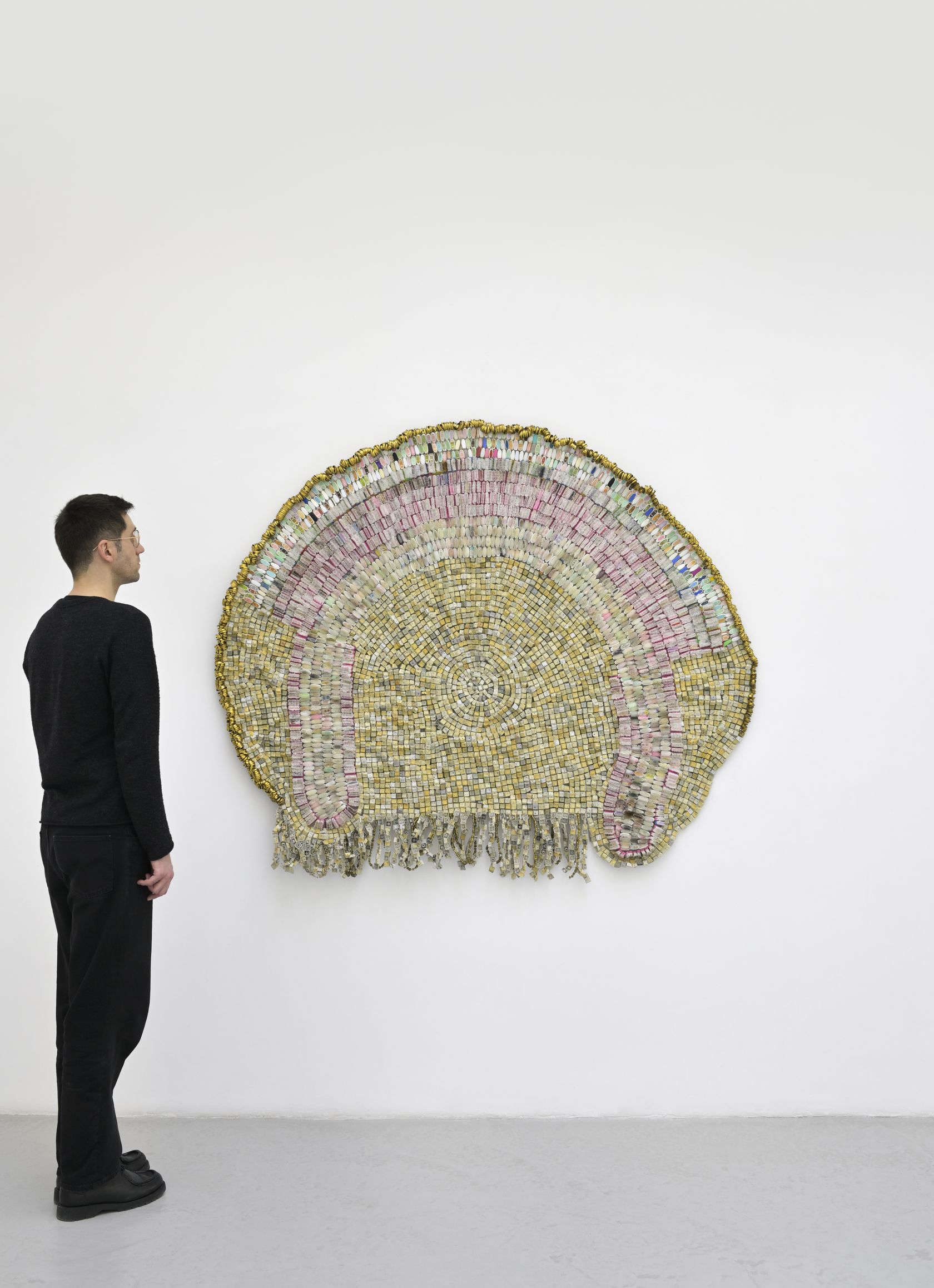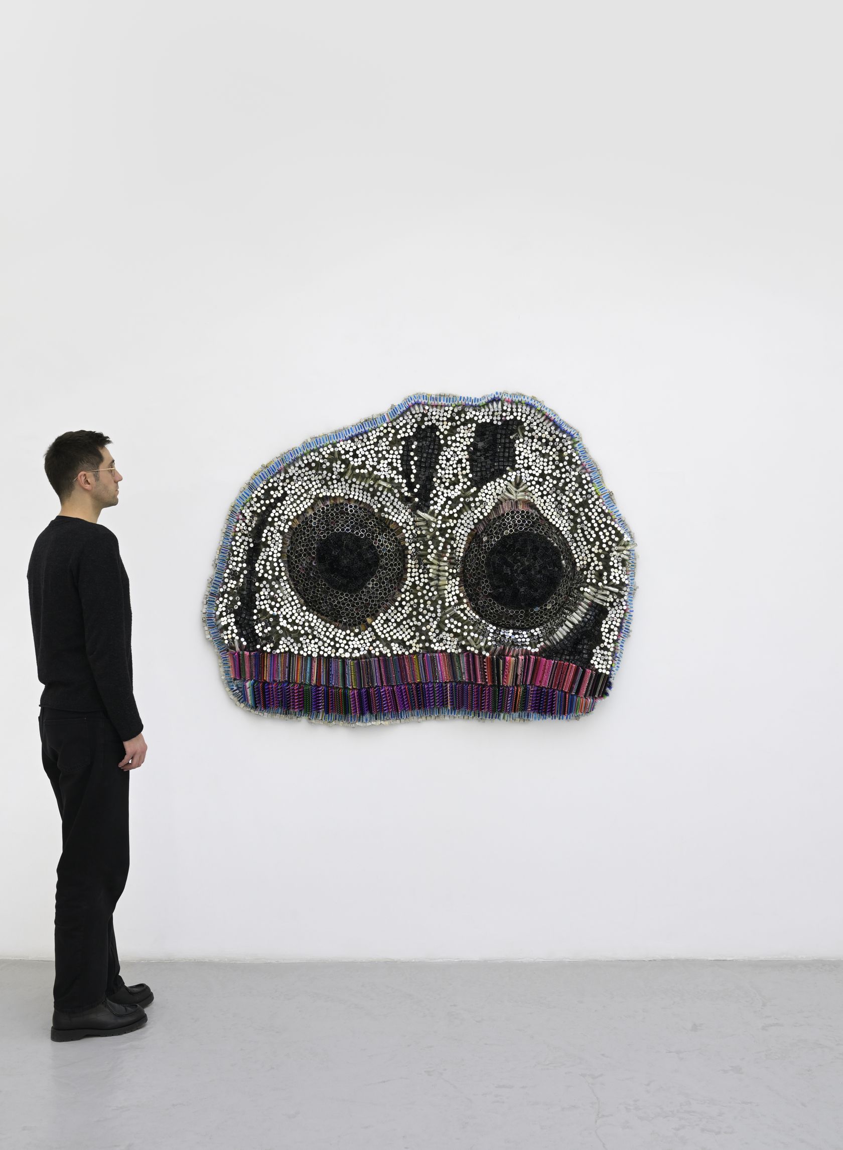 The Crown! pushes Takadiwa’s ongoing project further, reclaiming the leftover traces of everyday things and turning them into what you might call post-industrial textiles. These are not objects of comfort. They carry the tensions of Africa’s post-colonial afterlife: the politics of black hair, the hunger for small vanities, the choreography of conspicuous consumption. Afro combs, which appear throughout the show, serve as archives of social, political, and spiritual history, rooted in African traditions and the colonial self-fashioning they forced. Once tools for grooming and ritual, these combs now bear the weight of resistance and pride in Black political life.