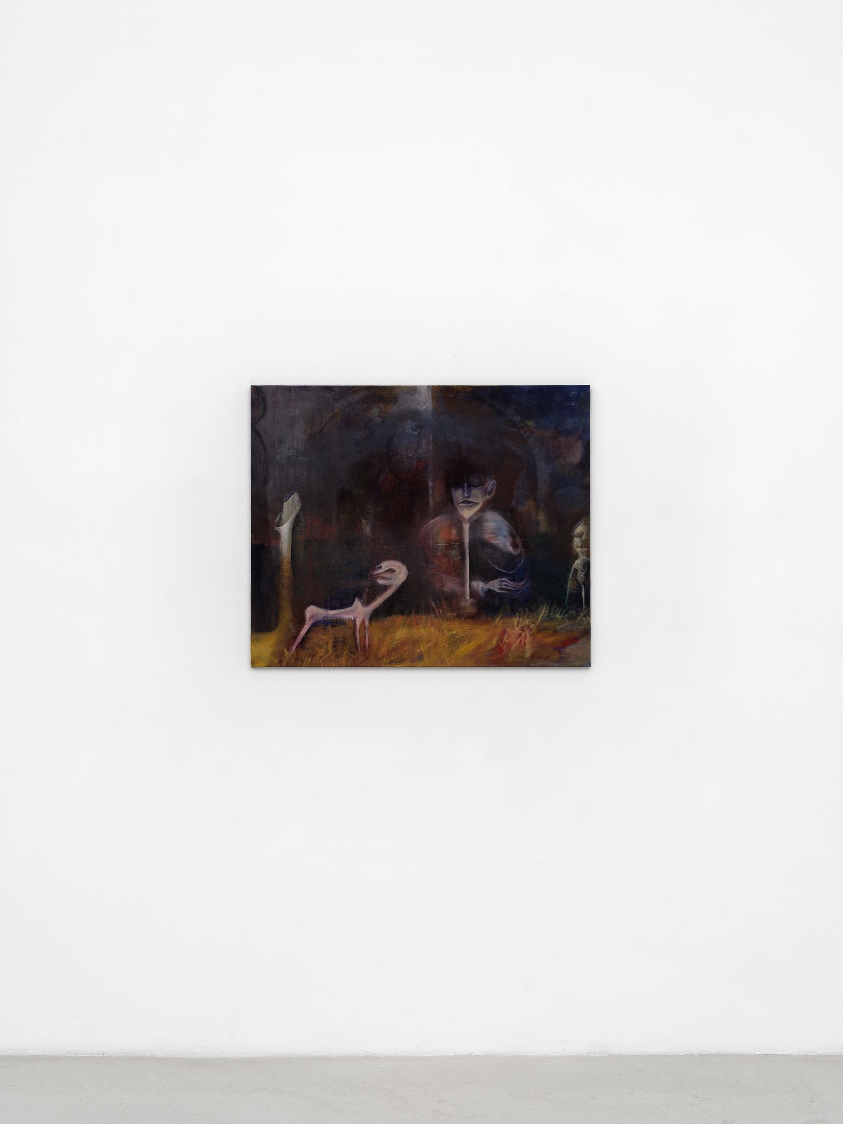 The artist likes to describe his painting as a receptacle, a tomb, a manuscript. It is the opposite of film, its residual shimmering, what survives once the screen and the light have been turned off. His painting plunges all the deeper into darkness and formlessness, from which springs the unknown, even the monstrous. His drawings search through the depths of the human psyche, examining its fantasies, illusions and dreams. It brings out images shaped by the universal unconscious, on the edge of fantasy and nightmare. Shadows, silhouettes and profiles cross the frame, as if returning from the depths and margins: they portray ghosts, elderly children, hieratic magicians or celebrants of a nocturnal ritual. This dark, almost sticky, universe is reminiscent of some of F. W. Murnau’s visions or scenes from Salò, or the 120 Days of Sodom (1975) by Pier Paolo Pasolini. This world is also very Lynchian in its atmospheres and intrigues, flirting with Eraserhead (1977) or Twin Peaks: Fire Walk with Me (1992).