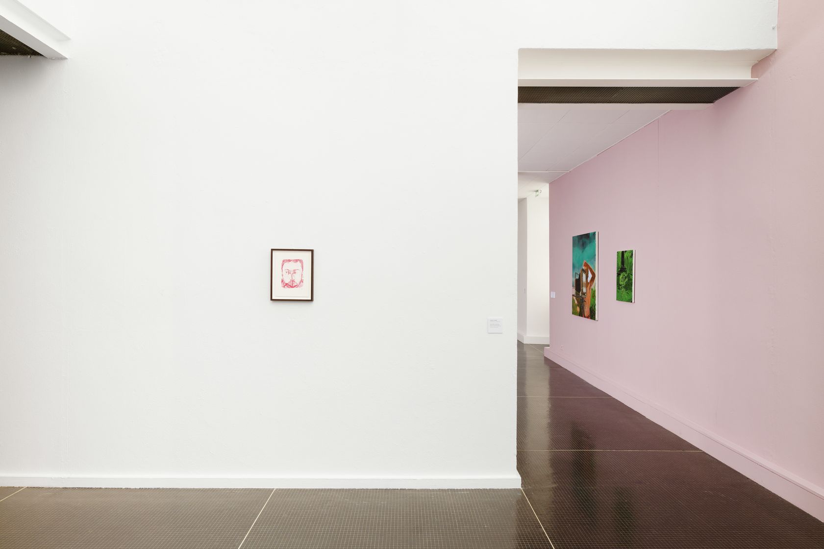 Au milieu de compositions complexes, la figure humaine émerge comme centrale, captée dans des situations ambiguës et des ruptures narratives. Silencieuse, comme suspendue, la peinture de Cudahy procède d’une dramaturgie. La recherche d’individualisation s’exerce dans le dessin délicat des visages, tandis que le corps ou l’environnement sont brossés énergiquement, par larges aplats abstraits. Les aberrations chromatiques et les contrastes tranchants de couleurs acides forment un déséquilibre et unissent des contradictions en apparence irréconciliables.