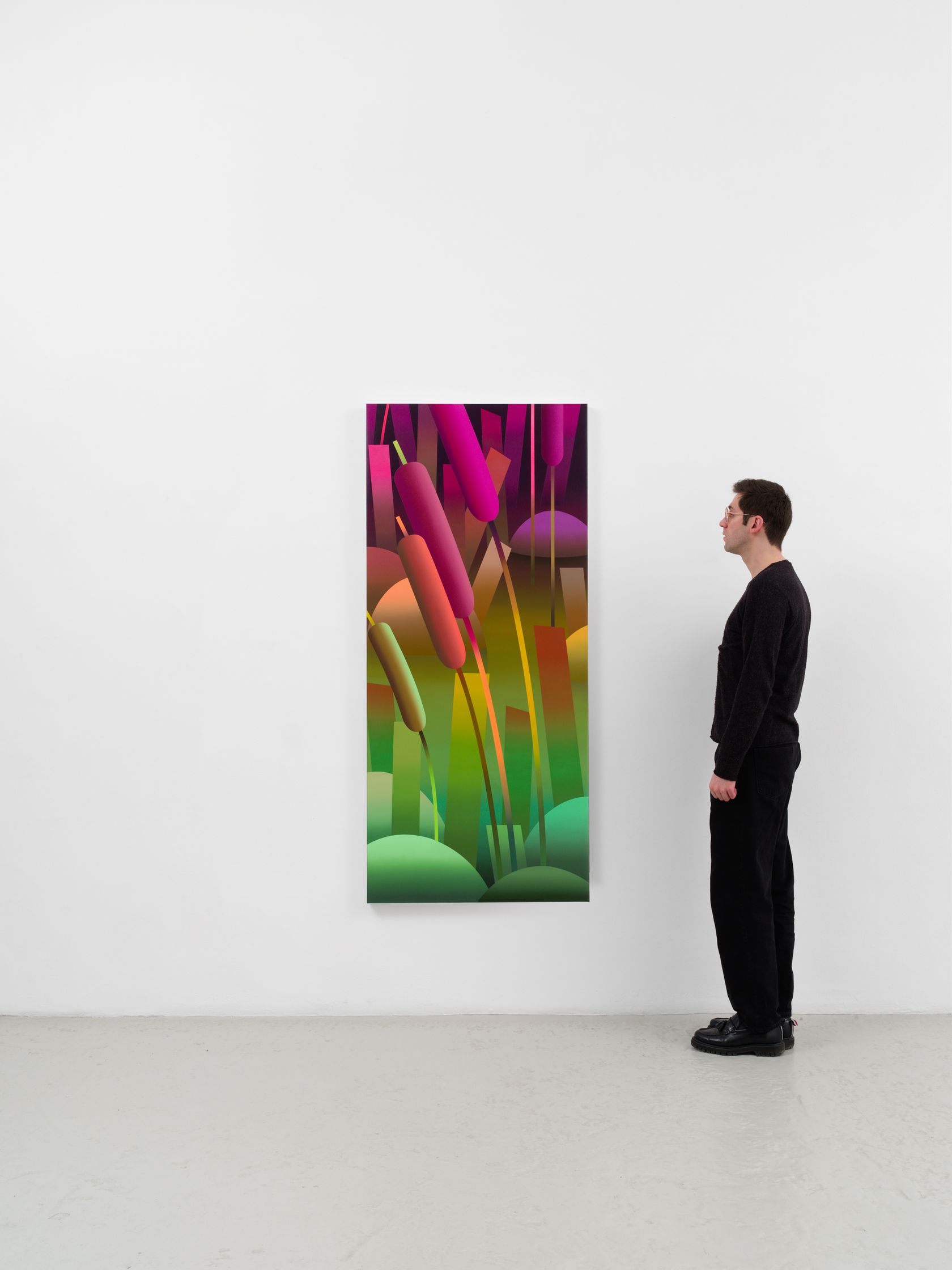 Oli Epp utilise le langage visuel des marques et oscille entre le graphisme et les surfaces peintes pour créer une confusion optique, faisant écho à la manière dont nos vies réelles et digitales fusionnent.