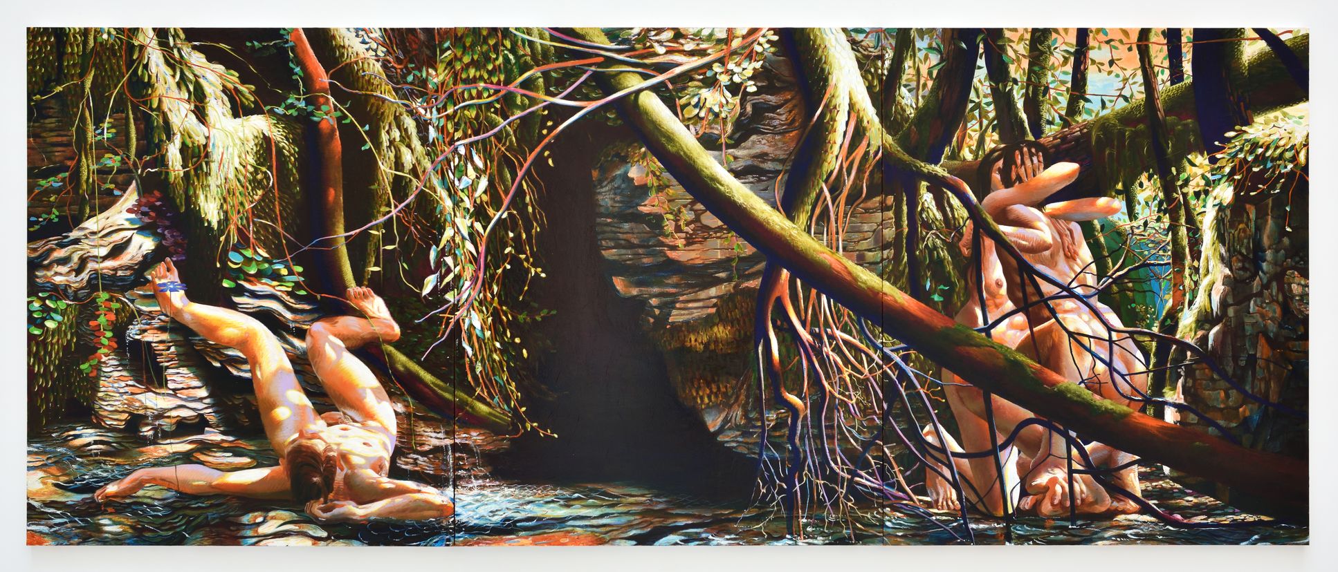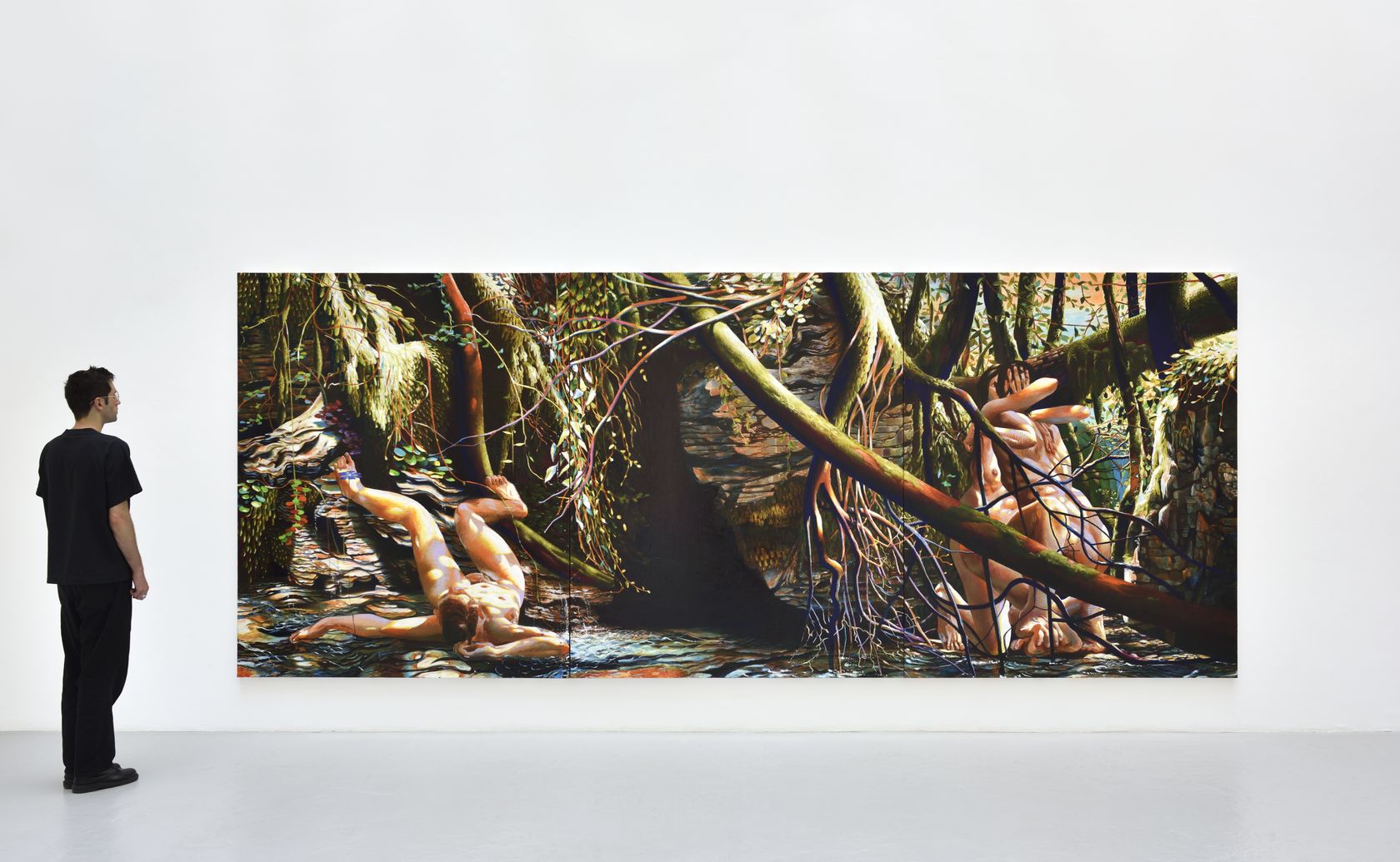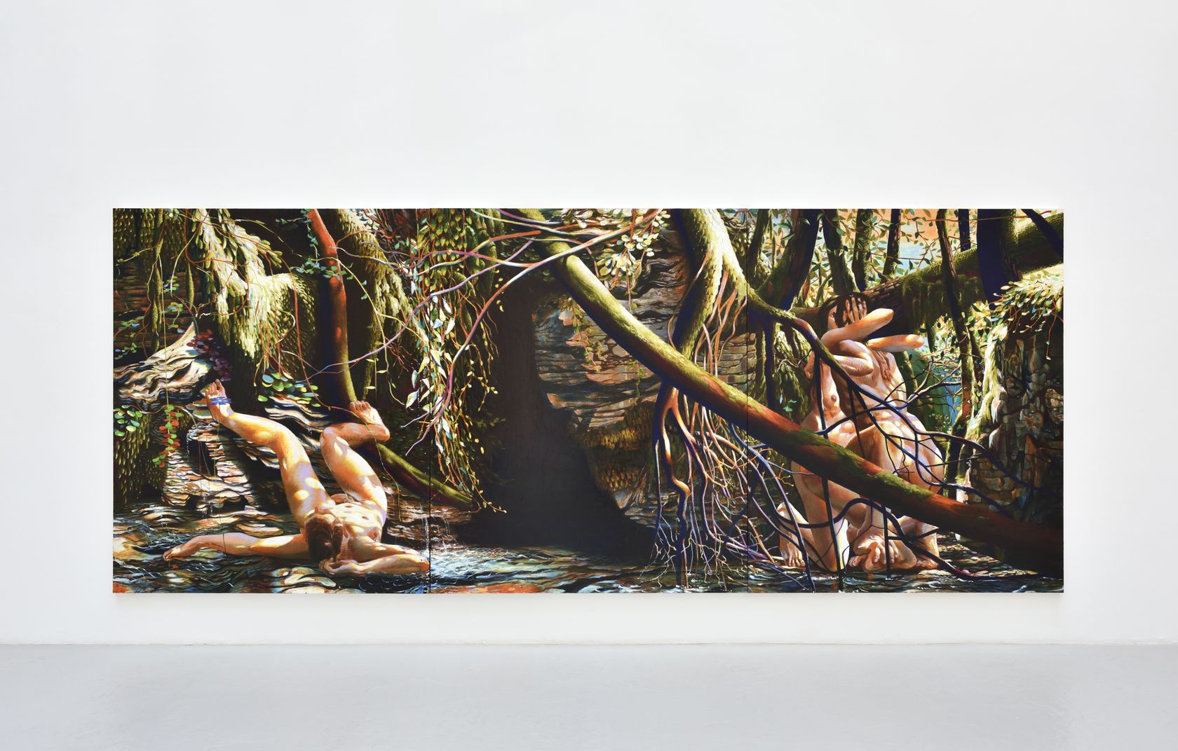 Les personnages présents rêvent un monde beaucoup moins innocent que les nus en pleine lumière de l’arbre penché ou ceux qu’on a pu voir lors de la rétrospective L’Arbre et la Machine au Musée de l’Abbaye à Saint-Claude (8 février-28 septembre 2025). On ne peut plus croire à leur totale nonchalance. Le temps n’est plus suspendu. La géométrie s’est complexifiée orchestrant une grande bataille à la façon d’Uccello où de toutes parts s’entrechoquent et craquent les branches du sous-bois. Quant aux corps, ils occupent l’espace encore vacant. Quelque chose vient de se produire : la glissade, le groupe enlacé. L’imminence devient peinture. Et Laurent Proux nous place, nous regardeurs, devant ce fragment de monde indécidable, fascinant de détails dans la multiplicité de ses anfractuosités, en nous ménageant non loin des amants, un passage illuminé. À nous de voir l’échappée.